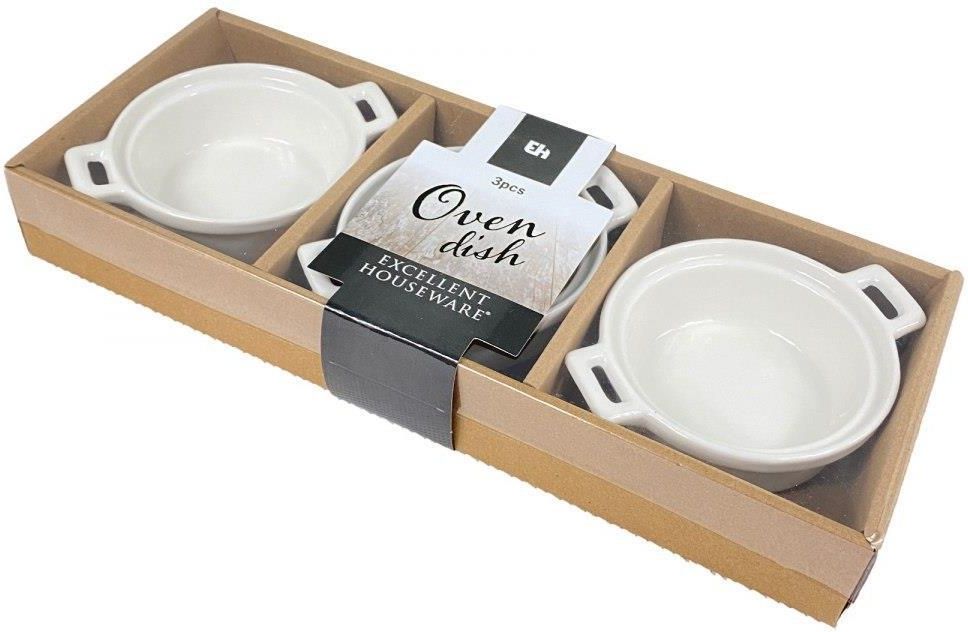 Miseczki do serwowania Kokilki 3szt. Miseczki do serwowania to komplet 3 foremek do pieczenia w ponadczasowej bieli. Solidne, wytrzymałe i wykonane z żaroodpornych materiałów naczynia do zapiekania potrzebne są w każdej kuchni. Miseczki posłużą także do efektywnego podawania przygotowanych potraw na stół bezpośrednio po wyjęciu z piekarnika. Jedzenie wolniej ostygnie, a Ty nie musisz martwić się potrzebą przekładania potrawy na kolejny talerz i stosem naczyń do mycia po posiłku. Naczynia posiadają wygodne uchwyty ułatwiające ich przenoszenie. Sprawdzą się idealnie przy podawaniu małych porcji Twoich ulubionych dań. Produkt można myć w zmywarce oraz używać w kuchence mikrofalowej. Miseczki przeznaczone do kontaktu z żywnością. Dzięki swojemu eleganckiemu opakowaniu produkt sprawdzi się także jako prezent, np. na parapetówkę. Parametry: Wysokość: 4 cm Długość: 12,5 - 14 cm Szerokość: 8,5 - 9,5 cm Pojemność: ok 150 ml Kolor dominujący: Biały Przeznaczenie: foremki do pieczenia Zestaw zwiera: 3 miseczki o okrągłym lub owalnym kształcie Wytrzymałość termiczna: Do 230° C. Produkt dostępny w 2 kształtach.