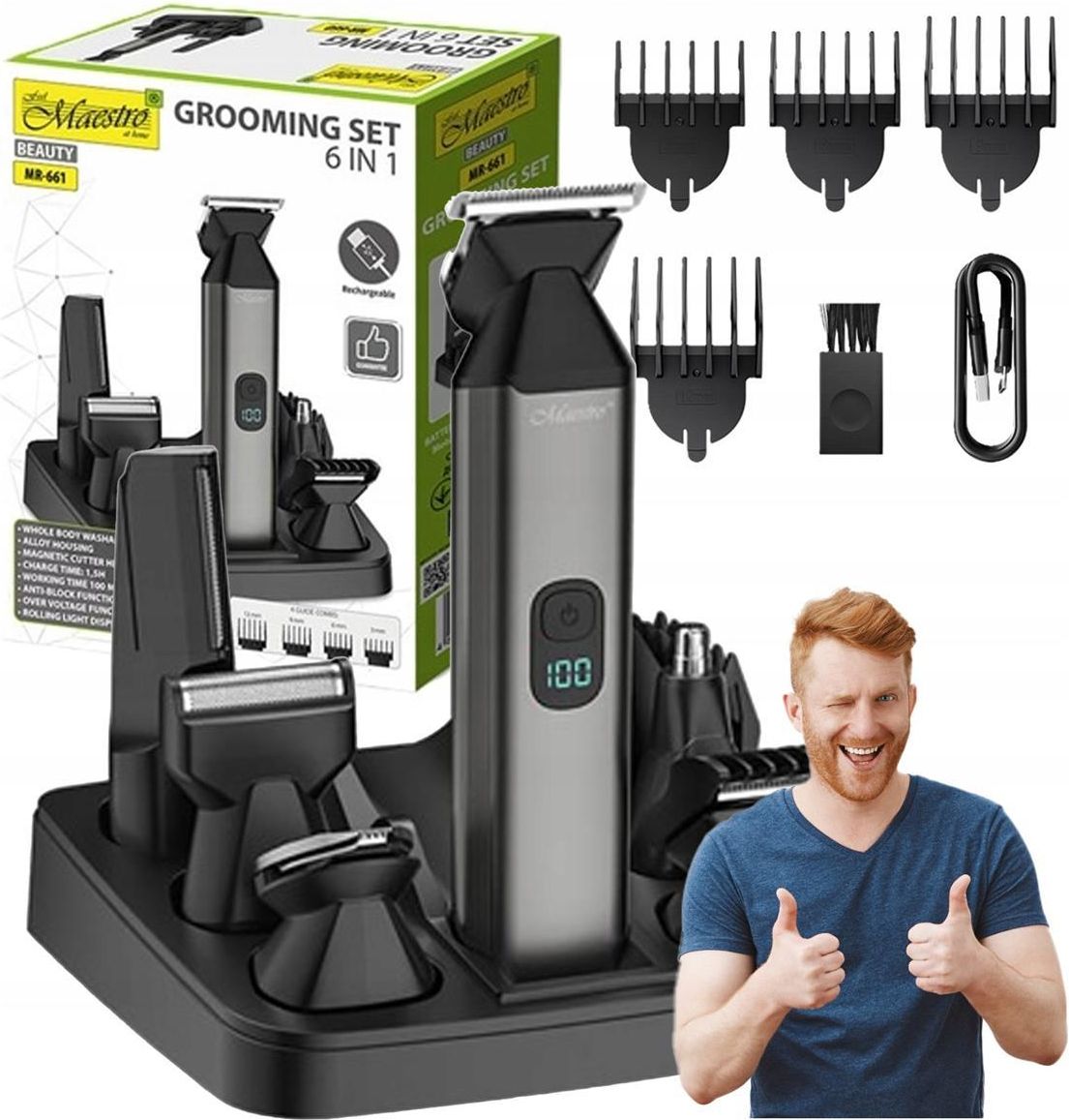 Zestaw do strzyżenia włosów 6w1 z ładowaniem USB - MAESTRO MR-661 Oferujemy Zestaw do strzyżenia włosów 6w1 USB MAESTRO MR-661, idealne rozwiązanie dla osób ceniących sobie wygodę i wszechstronność w pielęgnacji włosów. Dzięki różnorodnym głowicom i nasadkom grzebieniowym, zestaw ten pozwala na łatwe i precyzyjne strzyżenie, zapewniając znakomite rezultaty w domu. Dzięki wodoodpornej konstrukcji (IPX7) można go łatwo czyścić, co znacząco ułatwia jego użytkowanie. Praktyczny wskaźnik poziomu naładowania akumulatora informuje o stanie baterii, a możliwość ładowania przez port USB-C sprawia, że jego użycie jest niezwykle wygodne. Kolor produktu: Czarny Ilość nasadek grzebieniowych w zestawie: 4 Ilość głowic: 6 Wodoodporność: IPX7 Łatwość czyszczenia: Tak Typ produktu: Zestaw do strzyżenia włosów 6w1 USB Wskaźnik poziomu naładowania akumulatora: Tak Zawartość opakowania: Szczoteczka do czyszczenia, oliwa, kabel USB-C Bateria: Czas pracy 100 min Czas ładowania: 1,5 godz Rodzaj baterii: Litowa Pojemność baterii: 800 mAh Ostrzeżenie bezpieczeństwa: Przechowywać w suchym miejscu, chronić przed dziećmi, należy używać zgodnie z instrukcją Rodzaj baterii: Litowa Czas pracy: 100 min Wskaźnik poziomu naładowania akumulatora: Tak Łatwość czyszczenia: Tak Czas ładowania: 1,5 godz Ładowanie przez łącze USB C: Tak Ilość nasadek grzebieniowych w zestawie: 4 Wodoodporność: IPX7 Kolor produktu: Czarny Szczoteczka do czyszczenia: Tak Ilość głowic: 6 głowic(e) Pojemność baterii: 800 mAh Zawartość opakowania: Kabel USB-C Typ produktu: Zestaw do strzyżenia włosów 6w1 USB Dołączona oliwa: Tak Producent: Maestro SKU: MR-661 Produkt nowy i oryginalny - Zapewniamy, że oferowany przez nas produkt jest całkowicie nowy i oryginalny. Kompletny zestaw - Produkt dostarczany jest w oryginalnym opakowaniu, z pełnym zestawem akcesoriów, dokładnie tak jak dostarcza go producent. Autentyczność - Nasz produkt pochodzi z oficjalnych kanałów dystrybucji w Unii Europejskiej, co gwarantuje jego autentyczność oraz bezpieczeństwo użytkowania. Wsparcie producenta - Produkt objęty jest oficjalnym wsparciem producenta, zapewniającym pomoc i serwis na wysokim poziomie.