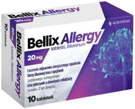 Bellix Allergy 20 mg 10 tabletek to lek na alergię zawierający bilastynę, substancję o działaniu przeciwhistaminowym. Produkt leczniczy łagodzi objawy sezonowego i całorocznego alergicznego nieżytu nosa, takie jak łzawienie, zatkany nos i kichanie. Ponadto Bellix Allergy lek może być stosowany w przypadku pokrzywki. Czas stosowania preparatu zależy od rodzaju i przebiegu choroby, jednak nie powinien wynosić więcej niż 10 dni bez konsultacji z lekarzem. Bellix Allergy 20 mg 10 tabletek jest odpowiedni dla dorosłych i młodzieży od 12. roku życia.