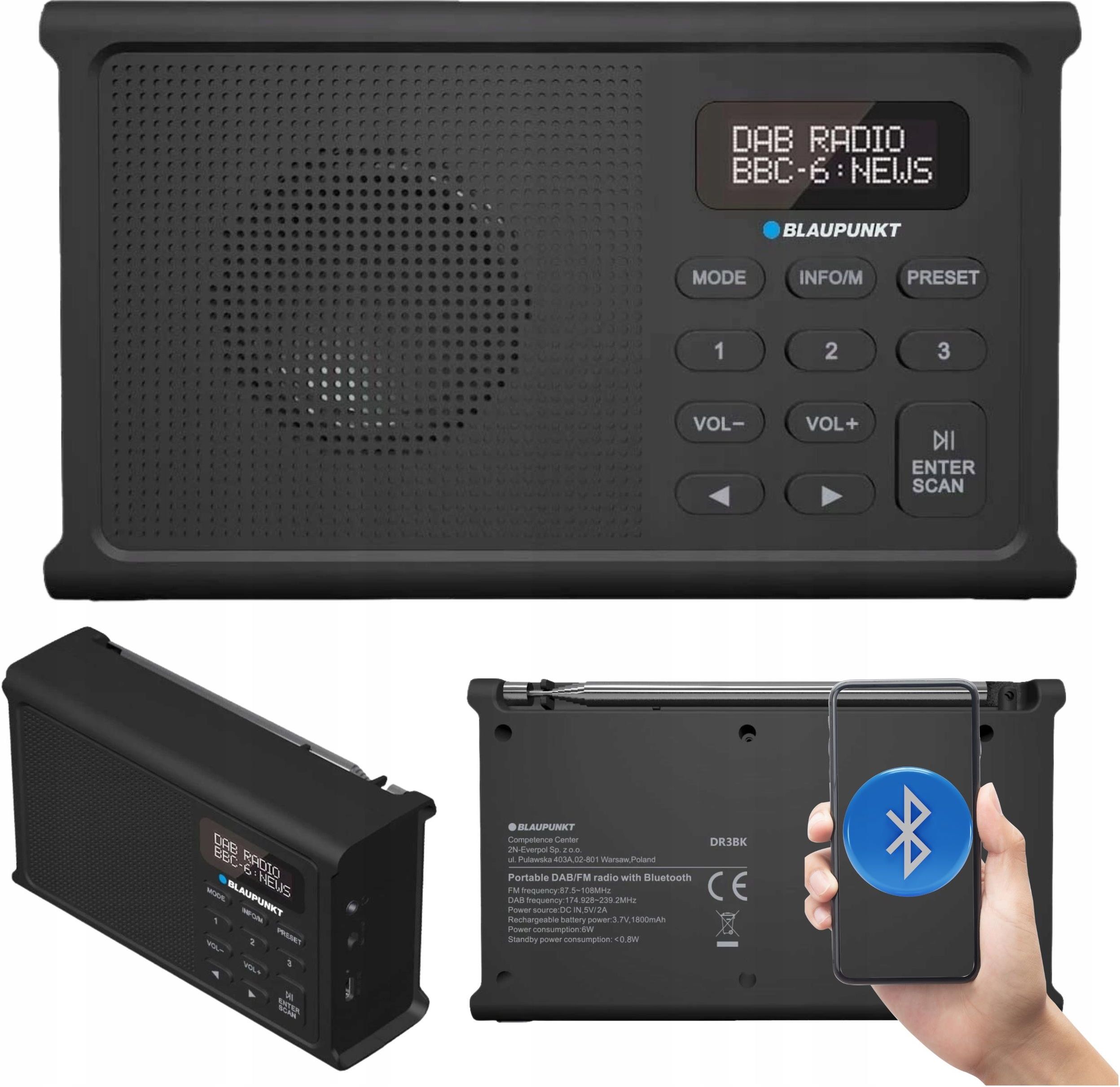 Przenośne radio DAB DR3BK Przenośny odtwarzacz z cyfrowym radiem DAB+ i tunerem FM. Urządzenie wyposażone jest w Bluetooth do bezprzewodowego odtwarzania muzyki z urządzeń przenośnych. Posiada wyjście słuchawkowe i wyświetlaczem LCD. Posiada również funkcję zegara i alarmu. Model ten jest zasilany wbudowanym akumulatorem, który można ładować przez złącze USB-C. Radio DAB+, Pasmo III (168~240 MHz) Radio FM z RDS (87,5~108 MHz) Możliwość zaprogramowania 40 stacji DAB i 40 stacji FM Antena teleskopowa (składana/obrotowa) Bluetooth 5.3 Wyjście słuchawkowe Wyświetlacz LCD Zegar z alarmem Wyłącznik czasowy Moc wyjściowa: 1,5 W RMS Wbudowany akumulator: 3,7 V/1800 mAh Czas odtwarzania: 11 godzin przy głośności 50% Czas ładowania: 4-5 godzin Ładowanie akumulatora przez USB-C Technologia DAB+ to przyszłość radia – oferuje krystalicznie czysty dźwięk, stabilny odbiór bez zakłóceń oraz dostęp do szerokiej gamy stacji w cyfrowej jakości. Coraz dynamiczniej rozwija się także w Polsce, obejmując kolejne regiony i zapewniając słuchaczom nowy standard radiowej rozrywki. Marka Blaupunkt, od dziesięcioleci kojarzona z niezawodnymi odbiornikami radiowymi, wychodzi naprzeciw tej technologii i prezentuje cztery zupełnie nowe modele radioodbiorników DAB+. To urządzenia, które łączą nowoczesność z funkcjonalnością – oprócz cyfrowego radia DAB+ oferują także Bluetooth do odtwarzania muzyki z telefonu, zegar z alarmem, a także klasyczny tuner FM z funkcją RDS. Wszystkie nowe radioodbiorniki Blaupunkt z serii DR są przenośne i wyposażone we wbudowany akumulator, co pozwala cieszyć się ulubioną muzyką i audycjami w dowolnym miejscu. Dodatkowo, trzy z czterech modeli dostępne są w dwóch wersjach kolorystycznych – eleganckiej czerni i nowoczesnej bieli, dzięki czemu każdy znajdzie wariant dopasowany do swojego stylu. Blaupunkt udowadnia, że tradycja i innowacja mogą iść w parze, dając użytkownikom codziennie więcej niż tylko radio. Kupując od nas masz pewność, że kupujesz produkt oryginalny, nowy i z oficjalnej dystrybucji Przenośny charakter urządzenia podkreśla wbudowany akumulator o pojemności 1800 mAh, który zapewnia do 11 godzin pracy przy 50% głośności. Ładowanie zajmuje zaledwie 4–5 godzin, a w zestawie znajduje się zasilacz 5 V / 2 A. Radio jest lekkie i kompaktowe – waży zaledwie 300 g, a jego wymiary to 153 × 90 × 45 mm. Dodatkowo posiada wyjście słuchawkowe, dzięki czemu można cieszyć się muzyką w pełnej prywatności. Blaupunkt DR3 to doskonały wybór dla osób, które oczekują nowoczesnego designu, mobilności i najwyższej jakości dźwięku w kompaktowej formie. Kompaktowy rozmiar, wielofunkcyjność, przenośność Podwójny tuner – cyfrowe radio DAB+ + analogowe FM PLL z RDS 80 zaprogramowanych stacji – 40 DAB+ i 40 FM ? Bluetooth – odtwarzanie muzyki bez kabli Zegar z podwójnym alarmem i drzemką – praktyczne rozwiązanie na co dzień 🔋 Wbudowany akumulator 1800 mAh – do 11 godzin pracy Szybkie ładowanie – pełne w 4–5 godzin, zasilacz w zestawie 🎧 Wyjście słuchawkowe – komfort prywatnego słuchania 📏 Lekki i kompaktowy – tylko 0,3 kg, wymiary: 153 × 90 × 45 mm Tuner FM teleskopowa antena, precyzyjne dostrajanie SPECYFIKACJA TECHNICZNA:⚙️ Radio DAB+, Pasmo III (168~240 MHz) Radio FM z RDS (87,5~108 MHz) Możliwość zaprogramowania 40 stacji DAB i 40 stacji FM Antena teleskopowa (składana/obrotowa) Bluetooth 5.3 Wyjście słuchawkowe Wyświetlacz LCD Zegar z alarmem Wyłącznik czasowy Moc wyjściowa: 1,5 W RMS Wbudowany akumulator: 3,7 V/1800 mAh Czas odtwarzania: 11 godzin przy głośności 50% Czas ładowania: 4-5 godzin Ładowanie akumulatora przez USB-C Zasilanie: DC 5 V, 2 A Wymiary urządzenia (SxWxG): 153 x 90 x 45 mm Waga netto urządzenia: 0,30 kg