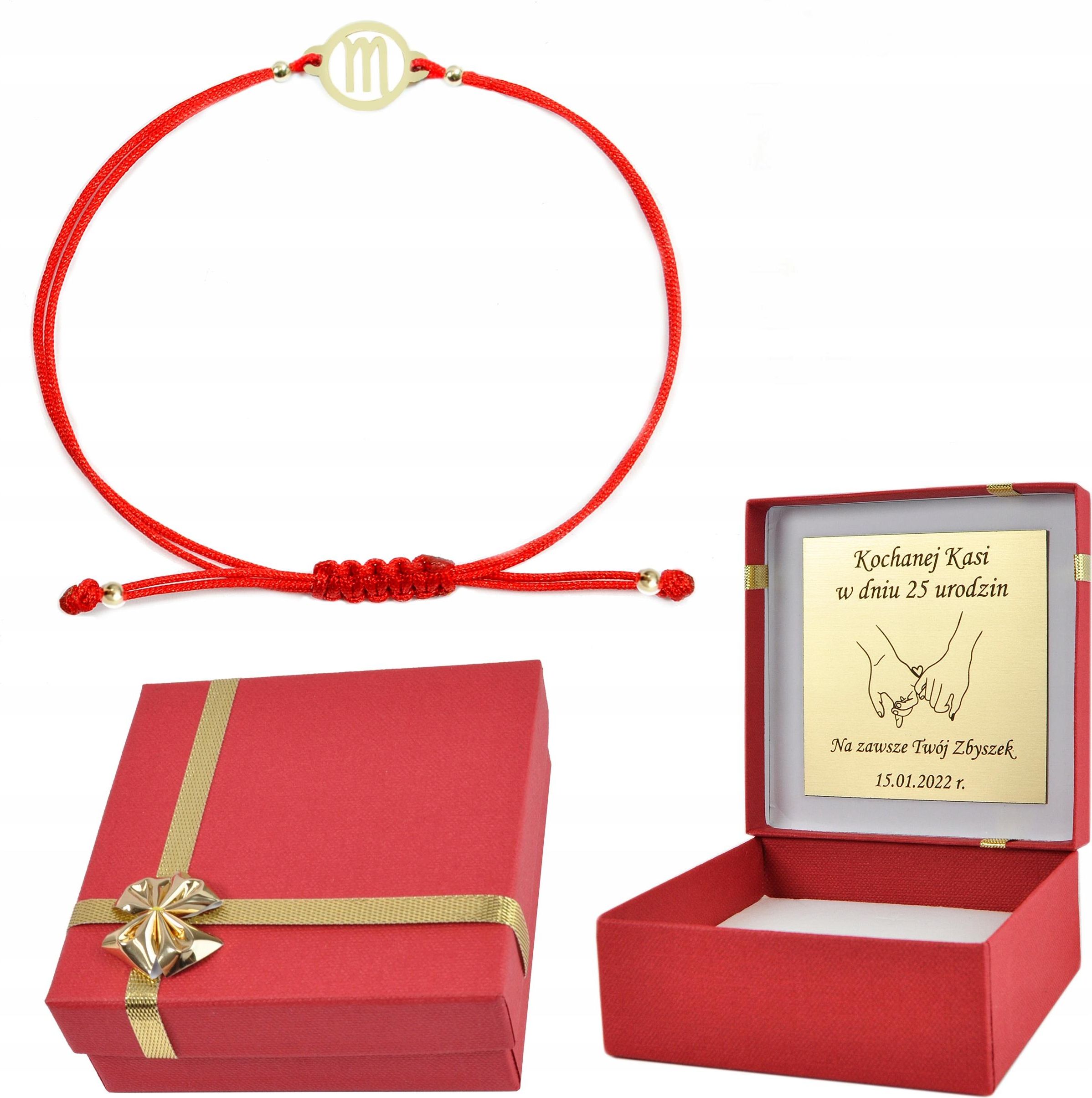 Bransoletka znak zodiaku skorpion, na sznureczku. Wykonana z wytrzymałego sznurka oraz złota próby 585 (14-karatów). Pociągając za sznureczki reguluje się długość bransoletki, dzięki czemu możesz dopasować ją do nadgarstka. Subtelna i delikatna uzupełni każdą stylizację Dane szczegółowe Rodzaj: bransoletka Kruszec: złoto próby 0.585 Waga: 0,70 - 0,80 g Motyw: skorpion kółko ze znakiem: 15x12 mm złote kluki (4)próby 0.585 waga samego złota ok 0,5g maksymalny obwód bransoletki ok 20cm możliwość wykonania wszystkich znaków zodiaku Mocne wiązanie zapewni łatwe i szybkie zakładanie bransoletki Biżuteria spakowana w eleganckie pudełeczko Aby prezent był wyjątkowy do biżuterii dodajemy pudełeczko z grawerowaną tabliczką. laminat o wymiarach około 65x65 mm z wybranym przez Ciebie wzorem. (tekst oraz grafika dowolna) Informację o grawerze należy umieścić w "wiadomości dla sprzedającego" od razu po zakupie. Jeśli nie otrzymamy informacji o grawerze wyślemy czyste pudełko. Ostępne kolory sznurka czerwony czarny fioletowy miętowy zielony różowy różowy neon granatowy niebieski błękitny szary zielony neon biały beżowy jaskrawy neon khaki