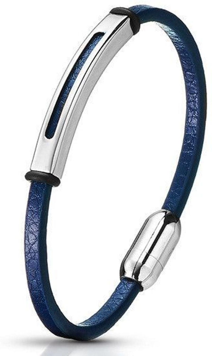 Bransoletka damska skórzana granatowa z elementem stalowy. Bransoletka wykonana z najwyższej jakości skóry. Idealny pomysł na prezent dla każdej kobiety. Bransoletka skórzana o delikatnej formie będzie idealnym prezentem dla ukochanej kobiety. Skórzana bransoletka damska została ozdobiona elementem stalowym, z możliwością wykonania na nim własnego graweru. Bransoletka skórzana posiada zapięcie na magnes dając pełną swobodę podczas codziennego użytkowania. Skórzane Bransoletki dla kobiet to biżuteria lubiana przez wiele Pań, rozmaitość wzorów i różnorodność kamieni sprawia że każda z Pań znajdzie coś wyjątkowego dla siebie. Zmysłowa srebrna biżuteria może być ozdobiona różnym wzorem bądź grawerem dzięki czemu będzie idealnym pomysłem na prezent. Rozmiar bransoletki : 17,5 cm
