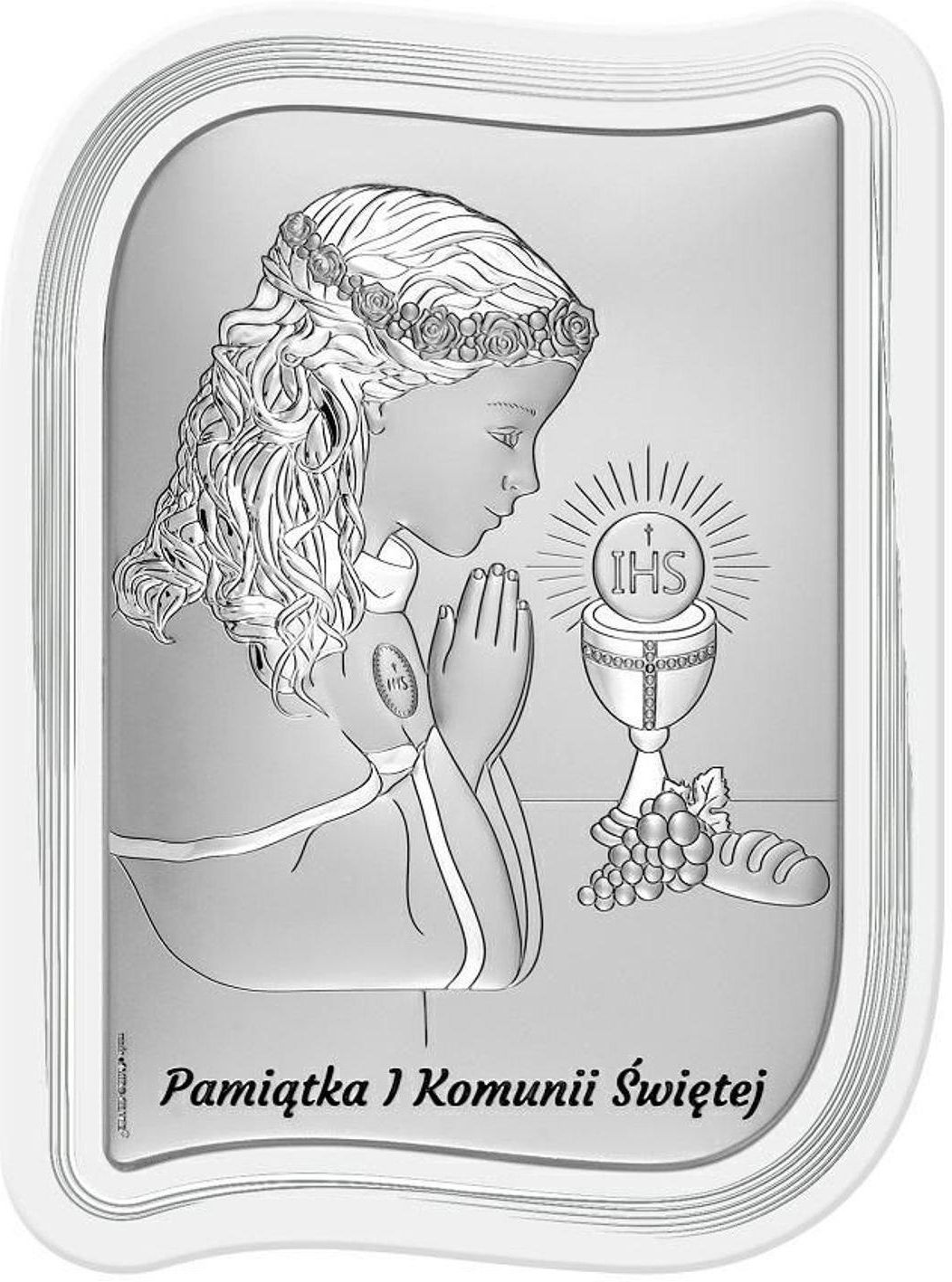 Obrazek pokryty srebrem – Pamiątka Pierwszej Komunii Świętej dla dziewczynki 6793W/2A Elegancki obrazek z wizerunkiem dziewczynki pochylonej nad kielichem to wyjątkowa pamiątka Pierwszej Komunii Świętej. Przypomina o duchowym wymiarze sakramentu i pięknych chwilach tego ważnego dnia. Wykonany z wysokiej jakości drewna oraz metalu pokrytego srebrem i lakierem zabezpieczającym, dzięki któremu produkt zachowa swój blask. Możliwość zawieszenia lub postawienia dzięki mocowaniom i nóżce. Zapakowany w eleganckie pudełko prezentowe. Wymiary: 8 x 11 cm Idealny także na rocznicę Komunii. Do obrazka proponujemy dołączyć metalizowaną, samoprzylepną plakietkę z wygrawerowanym tekstem.