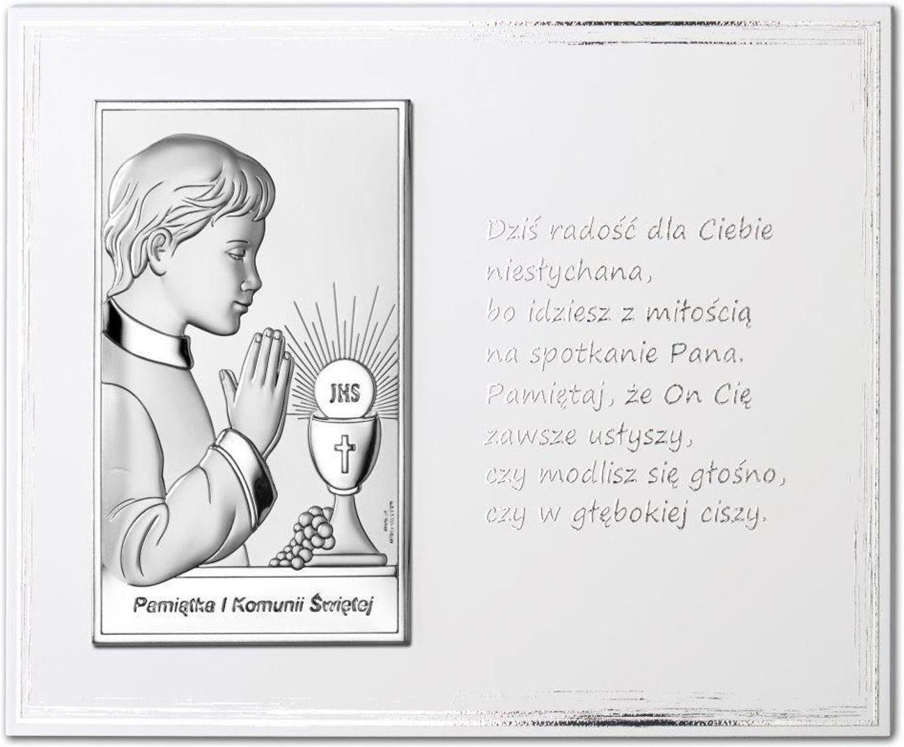 Srebrny obrazek o prostokątnym kształcie przedstawiający wizerunek Chłopca, kielich liturgiczny i hostię. To idealny pomysł na prezent na pamiątkę Pierwszej Komunii Świętej. Obrazek wykonany jest z aluminiowej blaszki pokrytej warstwą srebra, pokryty specjalnym lakierem ochronnym, dzięki któremu srebrna warstwa zachowa swój urok i blask na długie lata. Wizerunek umiejscowiony jest na przepięknie zdobionej drewnianej ramce w białym kolorze. Z tyłu obrazka znajdują się specjalne mocowania umożliwiające powieszenie na ścianie oraz nóżka do postawienia. Obrazek zapakowany jest w gustowne tekturowe pudełeczko firmowe. Prezent, który powstał po to, aby Pierwsza Komunia Święta stała się pięknym i niepowtarzalnym wspomnieniem. Idealny również na rocznicę tego ważnego wydarzenia. Do obrazka proponujemy dołączyć metalizowaną, samoprzylepną plakietkę z wygrawerowanym tekstem.