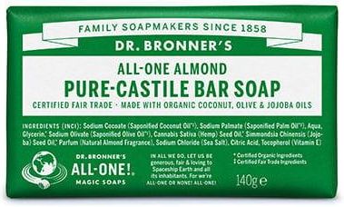 Mydło w kostce Dr. Bronner's - migdałowe 140g Opis: Kultowe mydło na rynku naturalnym ze 150 letnią tradycją. Najczystsze składniki organiczne, certyfikat Sprawiedliwego Handlu. Wegańskie, biodegradowalne, bezpieczne dla ciała i środowiska. Stworzone tylko z naturalnych składników biodegradowalnych (organiczne oleje: oliwa z oliwek, z ziaren palmowych, jojoba, kokosowy i konopny), pochodzących z certyfikowanych upraw biologicznych, bezpieczne dla ciała i środowiska. Cenny, organiczny olej konopny zapewnia naturalną, jedwabistą piankę, organiczny olej jojoba ma właściwości odżywcze, zapobiega wysuszaniu skóry. Organiczny olej palmowy daje mydłu miłą, zwartą konsystencję. Mydło delikatnie oczyszcza i pozostawia naturalny, subtelny zapach olejków eterycznych. Super kremowa konsystencja i nawilżanie. Mydło zawinięte jest w opakowanie wykonane w 10% konopi, lnu i 90% z papieru pochodzącego z recyklingu. Olejek z migdałów poprawia cyrkulację krwi, działa przeciwstarzeniowo i nawilżająco, dlatego często jest wybierany jako produkt do codziennego mycia ciała i włosów Sugerowane użycie:W połączeniu z niewielką ilością wody, delikatnie się pienią, oczyszczają i odżywiają skórę. Cenny, organiczny olej konopny zapewnia naturalną, jedwabistą piankę, organiczny olej jojoba ma właściwości odżywcze, zapobiega wysuszaniu skóry. Organiczny olej palmowy daje mydłu miłą, zwartą konsystencję. Mydło delikatnie oczyszcza i pozostawia naturalny, subtelny zapach olejków eterycznych. To mydło można zabrać ze sobą na wędrówki i używać bez negatywnych skutków dla środowiska naturalnego. Nadaje się do rąk, twarzy, ciała, i jest w 100% biodegradowalne. Mydło zawinięte jest w opakowanie wykonane w 10% konopi, lnu i 90% z papieru pochodzącego z recyklingu (PCR). Producent: Dr. Bronner's EAN: 0018787231005 Objętość: 140 g. Certyfikaty: USDA Organic, Fair For Life, Leaping Bunny – Not Animal Tested, Vegan Action, Non-GMO Project, NATRUE, BDIH INCI:Sodium Cocoate (Saponified Coconut Oil*+, Sodium Palmate (Saponified Palm Oil*+), Aqua, Glycerin*, Sodium Olivate (Saponified Olive Oil*+), Cannabis Sativa (Hemp) Seed Oil*, Simmondsia Chinensis (Jojoba) Seed Oil*, Parfum (Natural Almond Aroma), Sodium Chloride (Sea Salt), Citric Acid, Tocopherol (Vitamin E), Linalool** + Składniki z certyfikatem Sprawiedliwego Handlu * Składniki z certyfikowanych upraw ekologicznych ‘Kultowe’ mydła firmy Dr Bronner’sprodukowane z dbałością o pochodzenie składników organicznych, o dbałość o środowisko i zasady sprawiedliwego handlu. Magiczne mydła Dr. Bronner’s, wytwarzane na bazie czystego mydła kastylijskiego są naturalne, biodegradowalne, odpowiednie dla wegan oraz nietestowane na zwierzętach, co potwierdzają odpowiednie certyfikaty. Nie zawierają syntetycznych środków pieniących, zagęszczających ani konserwujących. Stworzone są tylko z naturalnych składników biodegradowalnych ( organiczne oleje roślinne, w tym oliwa z oliwek, olej jojoba, kokosowy i konopny), bezpiecznych dla ciała i środowiska. Produkcja mydła ekologicznego to prosty proces zmydlania olejów, które dzielą się na kwasy tłuszczowe i glicerynę. Nie generuje odpadów, rezultatem jest mydło stworzone z kwasów tłuszczowych wzbogacone o glicerynę. Mydła Dr. Bronner’s to produkty odpowiedzialne społecznie i środowiskowo. Najwyższa jakość w połączeniu z dbałością o pracowników i dostawców, dbałością środowisko i zwierzęta. MAGICZNE PRODUKTY DR. BRONNER'S• 150 TRADYCJI I DOŚWIADCZENIA• CERTYFIKOWANE KOSMETYKI NATURALNE•SKŁADNIKI Z CERTYFIKOWANYCH UPRAW EKOLOGICZNYCH• W100% BIODEGRADOWALNE• OPAKOWANIA W100% PODLEGAJĄ RECYKLINGOWI• 100% WEGAŃSKIE• CERTYFIKAT SPRAWIEDLIWEGO HANDLU• SKŁADNIKI ROŚLINNE• WSZECHSTRONNE ZASTOSOWANIE