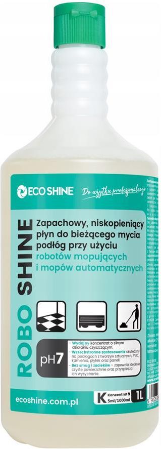 ECO SHINE ROBO SHINE 1 L Płyn do robotów myjących i mopów elektrycznych z funkcją automatycznego i ręcznego dozowania płynu Opis Wysokiej jakości płyn czyszczący do robotów myjących i mopów automatycznych, skomponowany z myślą o nowoczesnych systemach sprzątających, które wymagają delikatnych, a zarazem skutecznych rozwiązań. To produkt opracowany specjalnie do użytku z inteligentnymi urządzeniami sprzątającymi, takimi jak roboty mopujące i mopy elektryczne, które dzięki niemu pracują efektywniej, pozostawiając podłogi nieskazitelnie czyste i świeżo pachnące. Właściwości niskopieniący płyn do mycia podłóg do robotów mopujących i mopów automatycznych wydajny koncentrat o silnym działaniu czyszczącym nie pozostawia smug ani zacieków przyspiesza wysychanie powierzchni Zastosowanie roboty mopujące mopy automatyczne Pojemność 20 Litrów Sposób użycia mopy automatyczne: Rozcieńcz 5 ml płynu w 1000 ml wody. Lub przygotuj odpowiednio większą lub mniejsza ilosć płynu w zależności od pojemności zbiornika. Do zbiornika urządzenia wlej przygotowany roztwór. Po zakończeniu czyszczenia, dokładnie wypłucz urządzenie i zbiornik wodą. roboty mopujące z ręcznym dozowania płynu: Rozcieńcz 5 ml płynu w 1000 ml wody. Do zbiornika urządzenia wlej przygotowany roztwór. Po zakończeniu czyszczenia, dokładnie wypłucz urządzenie i zbiornik wodą. roboty mopujące z systemem dozowania płynu: wlej skoncentrowany płyn do zbiorniczka na płyn myjący. Robot myjący automatycznie pobierze i rozcieńczy płyn.