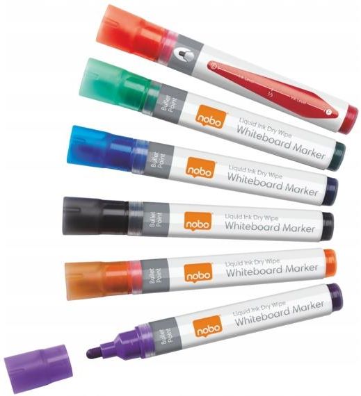 Marker suchościeralny Nobo Liquid Ink okrągła 6szt NOBO Markery suchościeralne z płynnym tuszem przeznaczone do pisania na tablicach suchościeralnych i flipchartach. Płynny tusz umożliwia jego bezproblemowy przepływ i zapewnia dobrą widoczność kolorów z daleka. Końcówka markera rysuje grube, szerokie linie, dzięki czemu przekaz jest dobrze widoczny i łatwy do odczytania . Wskaźnik poziomu tuszu informuje o ilości tuszu, jaka pozostała w markerze . 6 szt. w opakowaniu: czarny, czerwony, niebieski, zielony, pomarańczowy i fioletowy . cechy tuszu: suchościeralny ilość sztuk w opakowaniu: 6 szt. jednostka sprzedaży: 1 kolor: mix kolorów rodzaj: do flipchartów rodzaj końcówki: okrągła rodzaj obudowy: tworzywo z wymiennym wkładem: nie zmywalny: tak klasa produktu: Standard