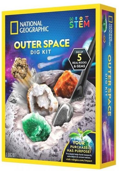 Awesome space-themed dig kit set with 5 real rock and gemstone specimens inside! The set includes pyrite, hematite, a geode piece, green fluorite, and red jasper along with a digging tool and magnifying glass. This dig kit is a perfect hands-on science activity kids will love. The included learning guide contains fascinating facts about each of the specimens hidden in the dig brick.
