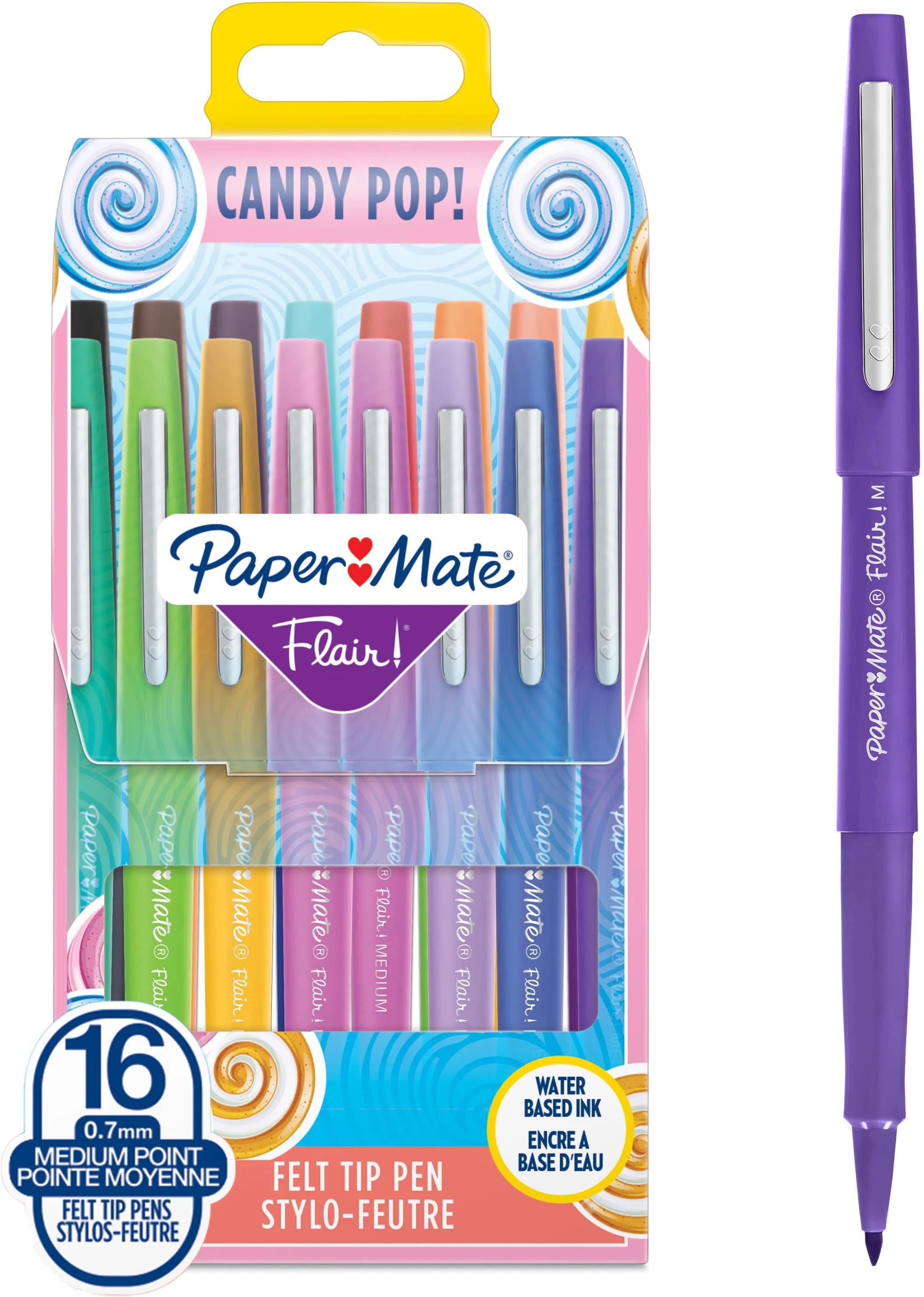 Transform your everyday writing into a delightful experience with the vibrant Paper Mate Flair Felt Tip Pens. These pens are not just writing instruments; they are a splash of joy in your stationery collection, designed to bring a burst of color to your notes, sketches, and doodles. Indulge in Candy POP Colours The Candy POP Assorted Colours set offers a palette of lip-smacking shades that promise to make even the most mundane tasks feel like a treat. Whether you're jotting down notes for class, doodling in your journal, or adding a splash of color to your planner, these pens are your perfect companions. Smooth and Reliable Writing Each pen is equipped with a medium point (0.7mm) that delivers deep, impactful lines, ensuring your writing stands out. The quick-drying ink resists smearing, so your work remains neat and clean, while the no-bleed technology ensures your creativity doesn't seep through the paper. Perfect for Various Uses These felt tip pens are ideal for a wide range of applications. From professional settings to school projects, they provide the versatility you need. Use them for writing, drawing, or even creating colorful charts and graphs. Their vibrant colors and smooth performance make them a favorite among students, professionals, and artists alike. Quality You Can Trust As a product of Paper Mate , these pens are crafted with the brand's commitment to quality and innovation. You can rely on their durability and consistent performance, making them a staple in your office or school supplies. Set Includes: This set includes 16 pens, each in a unique candy-inspired color, allowing you to mix and match for endless creative possibilities. Whether you're looking to brighten up your note-taking or add a pop of color to your artistic endeavors, the Paper Mate Flair Felt Tip Pens are your go-to choice for vibrant, reliable, and fun writing.