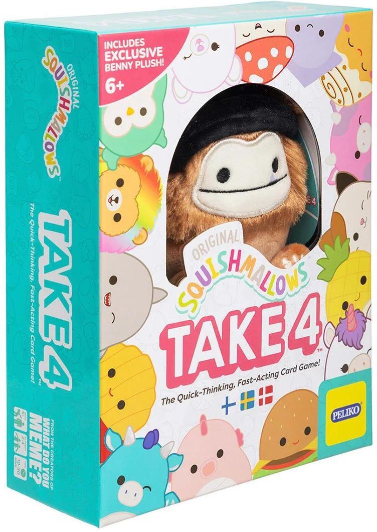 The Squishmallows Take 4 card game is a quick card game! In each round, the unique Squishmallows and 4 cards are placed face up in the centre of the group. Players compete to get 4 cards from the same team. Be the first to build a full Squishmallows team to win!