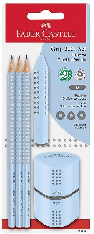 Zestaw ołówków FABER-CASTELL GRIP 2001,kolor jasnoniebieski, opakowanie typu blister Zestaw zawiera: 3 x ołówek GRIP 2001, twardość B 1 x trójkątna gumka GRIP 1 x trójkątna temperówka GRIP EAN: 4005405800749