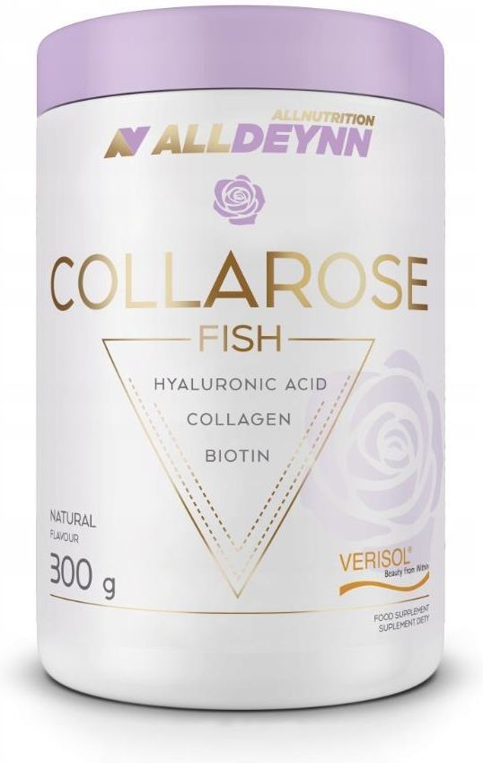 ALLNUTRITION ALLDEYNN COLLAROSE FISH (kolagen) NATURAL . COLLAROSE FISH OPAKOWANIE: 300 G, ILOŚĆ PORCJI: 50, HYDROLIZAT KOLAGENU VERISOL F®: 5000 MG, KOLAGEN RYBI Z PEPTYDAMI VERISOL® LEPSZA I SZYBSZA PRZYSWAJALNOŚĆ VERISOL® WSPIERA ZDROWIE WŁOSÓW, SKÓRY I PAZNOKCI AŻ 50 PORCJI W OPAKOWANIU EFEKTY POTWIERDZONE BADANIAMI ALLDEYNN COLLAROSE FISH jest idealnym suplementem dla kobiet, które chcą uzupełnić zbilansowaną dietę w składniki wspierające utrzymanie zdrowej i młodo wyglądającej skóry. Formuła dostarcza kolagen pozyskany z ryb oraz jest wzbogacona o kwas hialuronowy, witaminę C i biotynę. Preparat polecany szczególnie kobietom dbającym o piękny wygląd. COLLAROSE FISH zawiera opatentowane i produkowane przez niemiecki koncern farmaceutyczny GELITA hydrolizat kolagenu rybiego - VERISOL®, który wpływa na produkcję kolagenu od wewnątrz. ZALETY STOSOWANIA VERISOL VERISOL® składa się ze specjalnych peptydów kolagenowych - ważnych składników wspierających zdrową skórę, włosy i paznokcie. Stosowany doustnie, systematycznie wpływa na metabolizm kolagenu w skórze właściwej, a nie tylko dociera do zewnętrznych warstw skóry, jak robią to kremy i inne produkty do stosowania miejscowego [1]. VERISOL wpływa na metabolizm kolagenu w skórze bezpośrednio od wewnątrz. Zwiększa nawilżenie skóry i opóźnia powstawanie zmarszczek [2]. Firma GELITA opracowała ten produkt pod kątem zastosowania go w nutrikosmetologii i posiada badania kliniczne, potwierdzające ich skuteczność. CZYM JEST KOLAGEN? Kolagen to forma białka, która jest głównym spoiwem łączącym komórki naszej skóry i stanowi aż 80% jej suchej masy. Brak odpowiedniej ilości kolagenu jest najbardziej widoczny na twarzy i szyi, gdzie pojawiają się zmarszczki i niedoskonałości. Skóra wtedy opada i wiotczeje, ponieważ wraz z utratą kolagenu traci swoją elastyczność. DLACZEGO KOLAGEN RYBI? Kolagen rybi ma bardzo ważną cechę, jest bliźniaczo podobny do naszego własnego kolagenu. Zawiera wysokie stężenie glicyny, proliny i hydroksyproliny, czyli aminokwasów – związków budujących nasz organizm. Takiej budowy nie ma kolagen wołowy ani wieprzowy, wyłącznie kolagen rybi. Dzięki podobieństwu do kolagenu ludzkiego i aktywności biologicznej przyswajalność kolagenu rybiego jest wyższa niż kolagenu bydlęcego. Siła działania COLLAROSE FISH została wzmocniona innymi aktywnymi składnikami jak: Vitamina C, Biotyna, Kwas Hialuronowy. Dzięki COLLAROSE FISH masz gwarancję synergii działania i pozytywnego oddziaływania wielu składników. Źródło: [1-2] https://www.gelita.com/en/products/collagen-peptides/verisol "Effects of Collagen Hydrolysate on Skin Aging: A 30-Day Randomized, Double-Blind, Placebo-Controlled Study" Publikacja: Journal of Clinical and Aesthetic Dermatology, 2018r. Wyniki: 30-dniowa suplementacja kolagenem może redukować zmarszczki i poprawiać ogólny wygląd skóry. SKŁAD PRODUKTU Wartość odżywcza: 6 g (1 porcja) VERISOL® hydrolizat kolagenu: 5000 mg Witamina C: 120 mg / 150%* Kwas hialuronowy: 30 mg Biotyna: 2500 µg *RWS - referencyjna wartość spożycia Składniki: verisol® hydrolizat kolagenu rybiego, maltodekstryna, witamina c (kwas l-askorbinowy), hialuronian sodu, stabilizator: guma akacjowa, d-biotyna Alergeny:produkt może zawierać pochodne: zbóż zawierających gluten, soi, mleka, jaj Zalecane porcjowanie Jedną porcję (1 miarka 6 g) rozpuścić w 150 - 200 ml ciepłej wody, zamieszać, odstawić na kilka minut do całkowitego rozpuszczenia, następnie spożyć. Nie przekraczać 1 porcji dziennie. ŚRODKI OSTROŻNOŚCI I SPOSÓB PRZECHOWYWANIA Nie spożywać w przypadku uczulenia na którykolwiek składnik. Nie przekraczać zalecanej porcji dziennej. Suplement diety nie może być stosowany jako substytut zróżnicowanej diety. Zalecany jest zbilansowany sposób żywienia i zdrowy tryb życia. Nie zaleca się stosowania u osób chorujących na kamicę nerkową oraz mających tendencję do tworzenia się kamieni nerkowych. Produkt może zawierać pochodne: zbóż zawierających gluten, soi, mleka, jaj. Po użyciu opakowanie należy zawsze zamykać. Przechowywać w temperaturze pokojowej, w suchym miejscu, w miejscu niedostępnym dla dzieci. VERISOL® is a registered trademark of Gelita AG. VERISOL® jest zastrzeżonym znakiem towarowym firmy Gelita AG. Dystrybutor: SFD Spółka Akcyjna