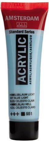 Talens Amsterdam farba akrylowa 20ml 551 Talens Amsterdam All Acrylics Acrylic Paints farba akrylowa wysoka odporność na światło; farby zawdzięczają zastosowaniu czystych, nie blaknących pigmentów wyjątkowa trwałość(środek wiążący składa się w 100% z żywicy akrylowej) odporne na substancje alkaliczne, dzięki czemu nadają się do malarstwa ściennego łatwo można rozcieńczyć wodą cechuje je krótki czas schnięcia i cienkie warstwy wysychają nawet w pół godziny dzięki specjalnej metodzie wytwarzania farby są praktycznie bezwonne pojemność: 20 ml kolor (nr/barwa): 551 sky blue light produkt holenderskiej firmy Talens