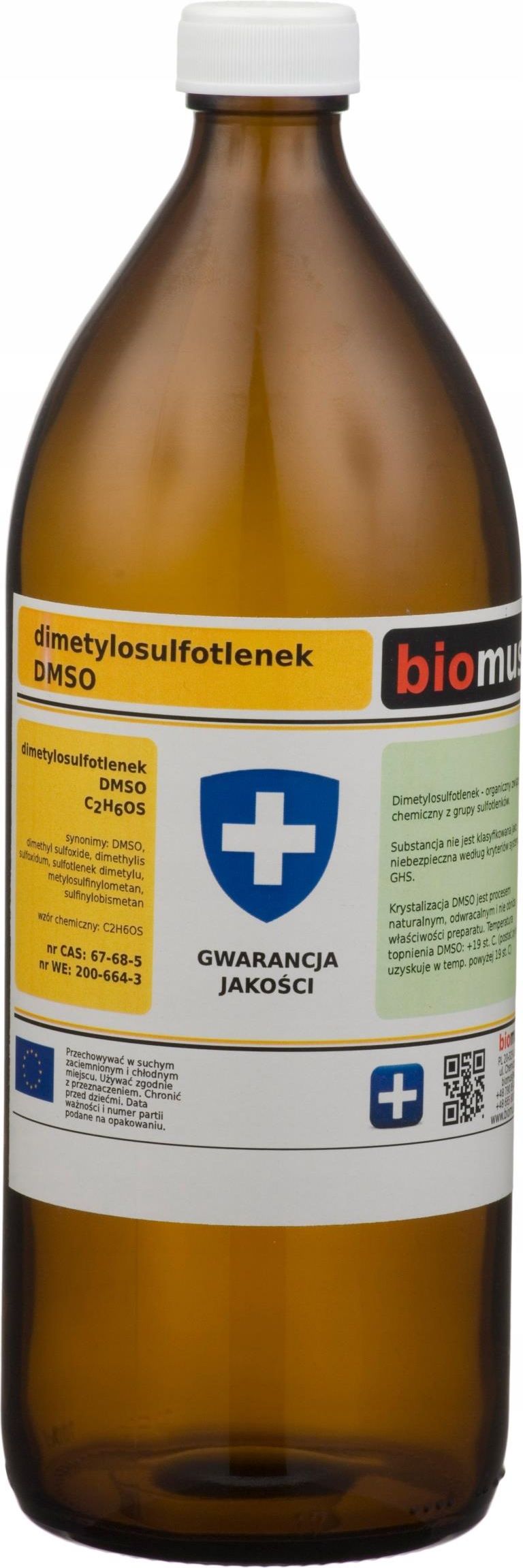 DMSO PREMIUM. Dimetylosulfotlenek BIOMUS 1kg produkcji europejskiej Nazwa: PREMIUM Dimetylosulfotlenek Synonimy: DMSO, dimetylu sulfotlenek, dimethyl sulfoxide, metylosulfotlenek, metylosulfinylometan, Gatunek: Czysty Czystość: Czysty min. 99,9% Zapach: delikatny, słodki Kolor: bezbarwny, klarowny Wzór chemiczny: (CH3)2SO, C2H6OS Nr CAS: 67-68-5 Nr WE: 200-664-3 Nr index: nie dotyczy Dostępne opakowania: 100g, 250g, 500g, 1kg DMSO Premium dzięki dodatkowej destylacji cechuje się wyjątkową formułą o zmodyfikowanym składzie i przede wszystkim łagodniejszym zapachu w odróżnieniu do klasycznego DMSO. Zapach DMSO Premium jest zdecydowanie mniej uciążliwy dla użytkownika. DMSO Premium jest produkowany w Europie. Gwarantujemy produkty wyłącznie najwyższej czystości i jakości. Produkt wysokiej czystości - bez domieszek i wypełniaczy. Produkt posiada atest - świadectwo kontroli polskiego laboratorium. Produkt przebadany pod względem jakości i zawartości. Produkt zgodny z polskimi i europejskimi normami jakości. Produkt dopuszczony do obrotu na terenie całej Unii Europejskiej. Produkt posiada kartę charakterystyki produktu tzw. MSDS. Produkt przeznaczony do zastosowań profesjonalnych. Produkt oznaczony jest zgodnie z europejskimi normami bezpieczeństwa CLP, REACH. Dimetylosulfotlenek. DMSO. Dimetylosulfotlenek (DMSO, z ang. dimethyl sulfoxide), (CH3)2SO – organiczny związek chemiczny z grupy sulfotlenków. Stosowany jest jako odczynnik analityczny i chemiczny, nośnik oraz jako rozpuszczalnik. DMSO jest substancją o wszechstronnym zastosowaniu. Informacja dotycząca opakowania: Informujemy że DMSO jest pakowane przez firmę Biomus w opakowania SZKLANE lub HDPE z tworzywa sztucznego przystosowanego oraz dedykowanego dla tej substancji i nie wchodzi w reakcję z DMSO. Informacja dotycząca specyficznej właściwości substancji: Czysty (100%) DMSO w temperaturze pokojowej jest płynem zaś w temperaturze DODATNIEJ poniżej PLUS 19 stopni C DMSO krystalizuje i wygląda jak lód. Właściwość ta świadczy o wysokiej czystości DMSO i nie wpływa na właściwości preparatu. Podczas krystalizacji radykalnie zmienia się objętość preparatu do około 70% pierwotnej objętości. Ze względu na ograniczenia prawne, nie możemy przedstawić Państwu pełnych właściwości produktu. Literatura Polecamy o zapoznanie się z treścią dwóch książek: 1. "DMSO. Naturalny środek przeciwzapalny i przeciwbólowy" - autor: Fischer, Hartmut - wydawnictwo: Vital Białystok 2. "DMSO. Strażnik zdrowych komórek" - autor: Z. Konderka - wydawnictwo: Enso Warszawa