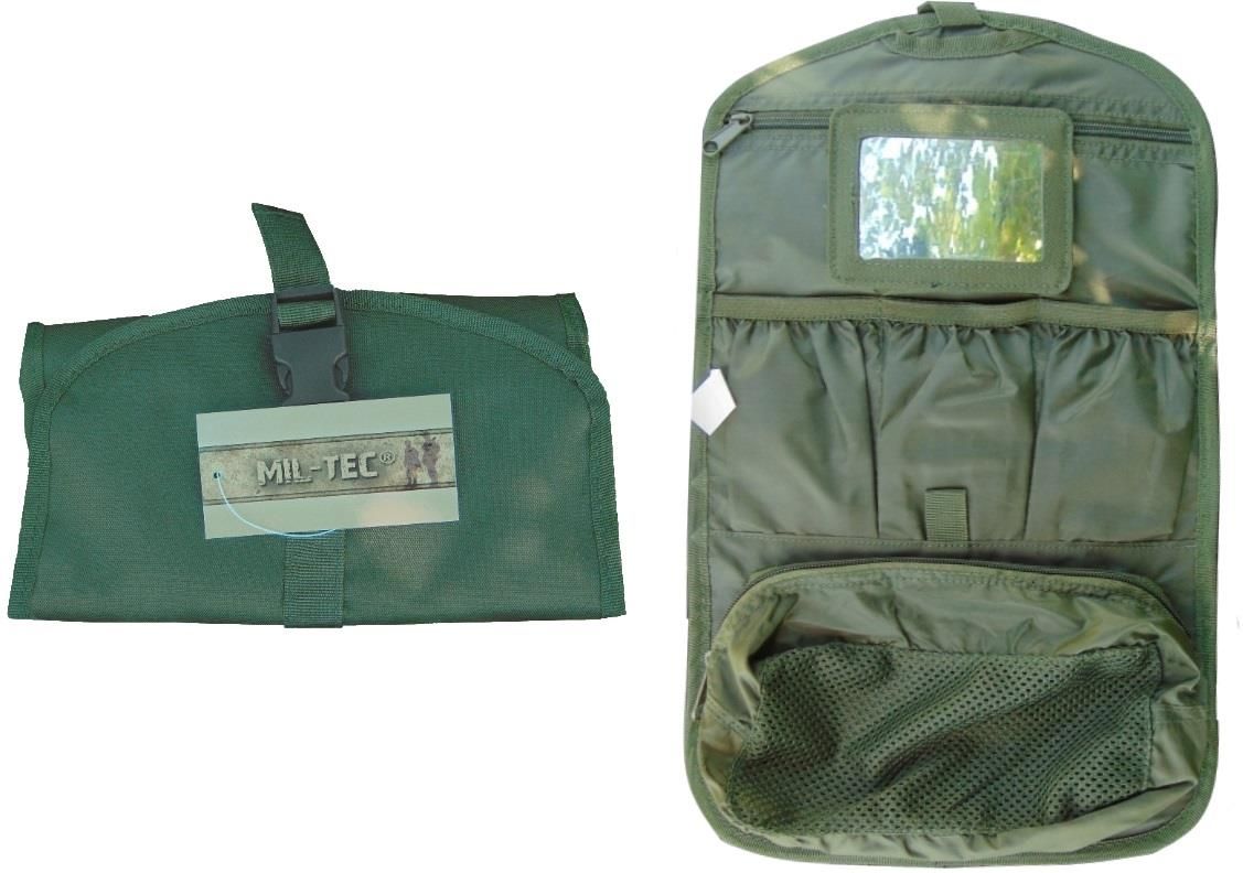 Kosmetyczka Turystyczna Mil-Tec OlivZostała wykonana z nieprzemakalnego materiału. Jest mała i kompaktowa dzięki czemu bez problemu zmieści się w każdym bagażu. Poliester z którego została wykonana cechuje sie wysoką odpornością na uszkodzenia mechaniczne. Brzegi dodatkowo zostały obszyte lamówką aby zwiększyć jej wodoodporność oraz wzmocnić łączenia. Kosmetyczka posiada jedną pojemną komorę na zamek, trzy kieszenie zakończone elastyczną taśmą na szampon, mydło itd., jedną pojemna kieszeń z siatki na zamek, przypinane na rzep lusterko kompozytowe, haczyk oraz niewielką, materiałową szlufkę umożliwiającą podczepienie dodatkowego oporządzenia. Saszetka zapinana jest trokiem wyposażonym w klamrę z tworzywa ABS. Wszystkie te udogodnienia pomogą utrzymać porządek i zarazem przetrwać w trudnych warunkach i w każdej sytuacji. Całość sprawdzi się podczas campingu, wyjazdów, wycieczek i obozów przetrwania. Specyfikacja: - Producent Mil-Tec, - Waga 200g, - Kolor Oliv, - Wymiary 26,5 x 16,5 cm - 100% Poliester,