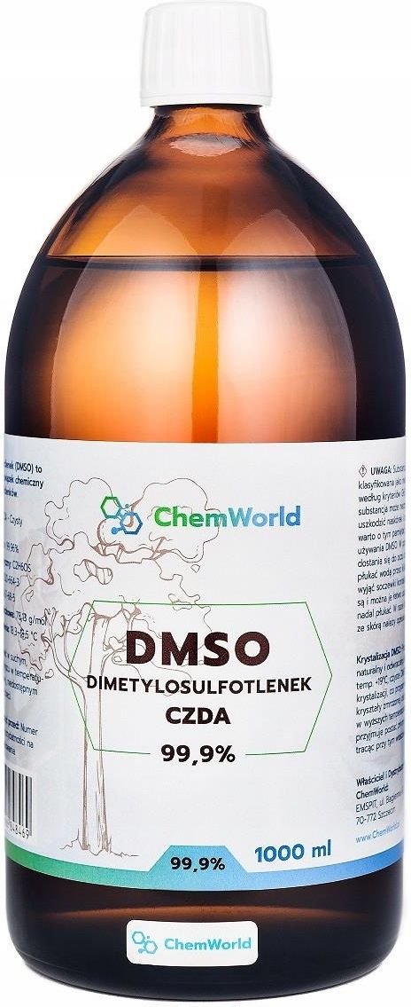 ChemWorldDMSO 99,99%, Czystość Farmaceutyczna1000 ml Według badań, testów i zapewnień producenta i wieloletniego dostawcy, czystość tego DMSO to Klasa Farmaceutyczna 99,99%, to produkt oczyszczony laboratoryjnie specjalną japońską metodą, która kwalifikuje ten produkt do klasy czystości farmaceutycznej. Jest to jedyne DMSO tak oczyszczone i o takiej jakości. (Farmaceutyczne DMSO jest testowane zgodnie z normą wykonawczą Enterprise Q/CZDL01-2017)No właśnie !!! DMSO, tak mnie w skrócie nazywają bo mam długą nazwę dimetylosulfotlenek no i trudną do wymówienia i chyba nie za bardzo mi się też podoba ta nazwa, tylko nikomu o tym nie mówcie, niech to zostanie między nami. Mimo wszystko jest o mnie głośno, moja popularność jest nadzwyczajna i nie przypadkowa. Jestem z tego dumny tym bardziej że należę do rodziny ChemWorld. Aha jeszcze coś, jestem pozyskiwany z miazgi drzewnej, natura mi jest bliska.DMSO (Dimetylosulfotlenek) to organiczny związek z grupy sulfotlenków. Jest naturalną substancją pochodzącą z miazgi drzewnej. DMSO za pośrednictwem tlenu przekształcany jest w MSM (siarka organiczna). DMSO to wysoce polarny aprotonowy rozpuszczalnik organiczny, który miesza się z wodą. Wiele związków, które nie są bezpośrednio rozpuszczalne w wodzie, można rozpuścić za pomocą DMSO w celu utworzenia stężonego roztworu podstawowego, który można dalej rozcieńczyć do żądanego końcowego stężenia w buforze wodnym. ŚRODKI OSTROŻNOŚCI: W razie połknięcia nie wywoływać wymiotów, przepłukać usta wodą. Natychmiast wezwać pomoc medyczną. W razie kontaktu z oczami płukać je dużą ilością wody, niezwłocznie skontaktować się z okulistą. W razie kontaktu ze skórą zdjąć zanieczyszczoną odzież, skórę zmyć dokładnie wodą. Zanieczyszczoną odzież natychmiast zanurzyć w wodzie i starannie wypłukać.PRZECHOWYWANIE: Przechowywać w suchym, ciemnym i chłodnym miejscu, niedostępnym dla małych dzieci.UWAGA !! PRODUKT NIE JEST LEKIEM , PRODUKT TEN JEST ODCZYNNIKIEM CHEMICZNYM ANALITYCZNYM DO SYNTEZ I CELÓW EDUKACYJNYCH, MOŻE BYĆ SZKODLIWY DLA ZDROWIA, KAŻDE INNE STOSOWANIE ODCZYNNIKA CHEMICZNEGO JEST NA WŁASNĄ ODPOWIEDZIALNOŚĆ. O marce ChemWorldChemWorld to marka, której produkty są tworzone w/g procedur napisanych przez profesjonalnych chemików, wyszukujemy na całym świecie najlepsze i najczystsze formy substancji do naszych produktów, najczystsza i najbardziej skuteczna forma naszych produktów jest starannie przygotowywana i konfekcjonowana z wielką starannością, aby zachować najwyższą jakość produktów i usług. Ponadto, aby sprostać co raz większym wymaganiom rynkowym i naszych odbiorców, wybieramy tylko certyfikowane i sprawdzone źródła dostaw.Chemia jest niezbędna, wszystko co nas otacza jest chemią, bez związków chemicznych, substancji i zachodzących między nimi reakcji, nie byłoby roślin, zwierząt, ziemi i w tym wszystkim nie byłoby nas – LUDZI.Dziękujemy za zaufanie - Zespół marki ChemWorld