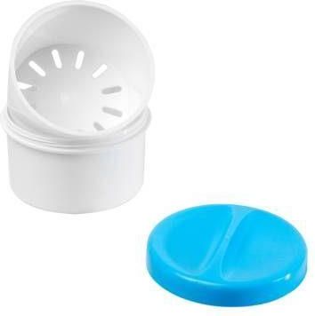 Opis Pudełko służy do higienicznego przechowywania i czyszczenia protez. Pojemnik posiada tackę odpływową (sitko), która umożliwia usunąć nadmiar wilgoci, dzięki czemu pozostaje on suchy i czysty. Wykonane z materiału, który jest odporny na wysokie temperatury, bezpieczny i bezzapachowy. Łatwy w utrzymaniu czystości. Opakowanie jest małe i poręczne, nadaje się do zabrania ze sobą. Pojemnik wykonany z polipropylenu w kolorze białym z niebieską pokrywką. Posiada sitko do łatwego czyszczenia i odkażania protez i aparatów. Możliwość sterylizacji do 130°C. Temperatura topnienia 153oC. Produkt wielokrotnego użytku. Przed pierwszym użyciem należy zapoznać się z dołączoną instrukcją obsługi. Produkt przeznaczony do użytku zgodnie z jego przeznaczeniem. Wymiary produktu: Pojemnik średnica x wysokość:98 x 63 mm Sitko średnica x wysokość: 93 x 55 mm Instrukcja obsługi: Przed pierwszym użyciem umyj pojemnik ciepłą wodą z łagodnym płynem. Unieść sitko i włóż do pudełka tabletkę czyszczącą. Połóż protezę na sitku i umieść w pudełku. Napełnij wodą pojemnik, aby proteza w całości znajdowała się pod wodą. Po oczyszczeniu wyjmij protezę wraz z sitkiem z pudełka, spłucz dobrze pod bieżącą wodą. Wysusz sitko z protezą. Umyj pudełko, włóż sitko z czystą/suchą protezą i nakryj pokrywką.