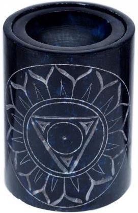 Ciemnoniebieski kominek do aromaterapii z rzeźbionym symbolem przedstawiającym czakrę gardła. Będzie praktyczną ozdobą każdego wnętrza, w którym zechcemy wprowadzić atmosferę harmonii i spokoju oraz wzmocnić wibracje czakry gardła. Sposób użycia: 5-10 kropli olejku zapachowego wlać do miseczki kominka wypełnionej wodą. W przypadku wosku zapachowego umieścić go w miseczce. Zapalić świeczkę typu tealight i umieścić ją na podstawie wewnątrz kominka. Nie należy zostawiać kominka zapachowego z zapaloną świecą bez nadzoru, bo po wyparowaniu wody w miseczce kominek może ulec uszkodzeniu. Kolorem czakry gardła jest kolor niebieski. Ta czakra jest powiązana z szyją, ramionami, gardłem, górną częścią pleców. Ma związek z takimi kwestiami, jak kontrola, zaufanie, urazy i poczucie bezpieczeństwa przy wyrażaniu swojej wewnętrznej prawdy. Czakra jest „nadwerężona”, gdy mamy problemy z poczuciem własnej wartości lub brakuje nam siły osobistej. Kominek wykonany jest ze steatytu. Opakowany jest w kartonowe pudełko. Wymiary kominka: 9 x 6 cm.