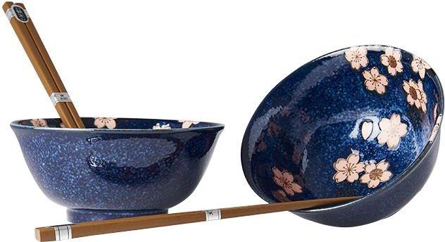 Zestaw prezentowy 2 miseczek o pojemności po 500 ml. z kompletem pałeczek w ozdobnym czarnym eleganckim opakowaniu. producent: Made in Japan linia: Pink Sakura Made in Japan to luksusowa marka, której produkcja odbywa się bezpośrednio na wyspie Honsiu w Japonii. W tym regionie występuje mnóstwo gliny - surowca do wyrobu ceramiki co daje początek wielowiekowej tradycji. Wszystkie produkty wykonywane są ręcznie przez lokalnych rzemieślników. Każde naczynie jest funkcjonalne, dobrze zaprojektowane, trwałe i niepowtarzalne. Marka słynie z niesamowitych wzorów, wyraźnych kolorów oraz odpornością na pękanie. LINIA: Pink Sakura ILOŚĆ: 2 x miska, 4 x pałeczka, 1x pudełko ŚREDNICA: 15 cm. POJEMNOŚĆ: 500 ml. CHARAKTERYSTYKA Zestaw prezentowy 2 miseczek o pojemności po 500 ml. z kompletem pałeczek w ozdobnym czarnym eleganckim opakowaniu. Miseczki ozdobione są wzorem z różowych kwiatów na granatowym tle wewnątrz i odwrotnie po zewnętrznej stronie misy. Naczynia umieszczone są w czarnym pudełku, które nadaje się na prezent.