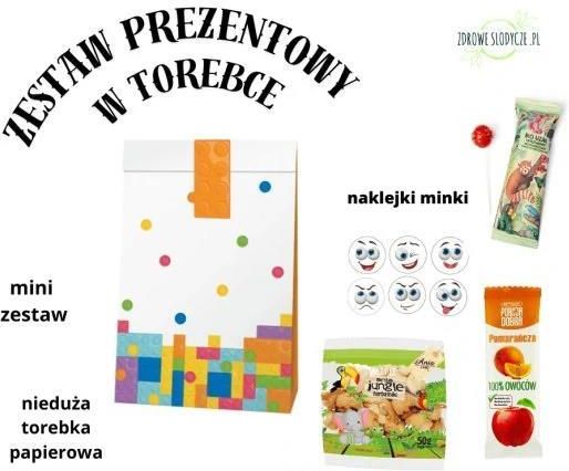 Zestaw prezentowy / mini upominek dla dzieci (Dzień Dziecka, Dzień Przedszkolaka, Święta) w estetycznej papierowej torebeczce o wymiarach ok. 10 x 15,5 x 5,5 cm. Torebki są w kilku zbliżonych wersjach kolorystycznych i mogą się od siebie różnić - wzory wysyłane losowo. Zestaw zawiera 3 smakołyki - przekąski i słodkości z dobrym składem plus zestaw naklejek "minki". W skład zestawu wchodzą: 1. Lizak owocowy Lizuu 2. herbatniki mini jungle Ania 50g 3. przekąska owocowa listek Porcja Dobra 4. naklejki - 6 minek, które mogą posłużyć np. do stworzenia postaci (dziecko może dorysować do buziek resztę postaci / stworka) Smak poszczególnych produktów może być inny niż na zdjęciu. Zestaw upominkowy może zostać wysłany do kupującego lub bezpośrednio do osoby, którą chcą Państwo obdarować (jeśli odbiorca jest inny niż zamawiający prosimy o zaznaczenie podczas finalizacji zamówienia opcji "wysyłki zamówienia bez paragonu w paczce" oraz o podanie danych do wysyłki). Taka opcja (tzw. Zdrowa Poczta upominkowo - słodyczowa) to świetny pomysł gdy nie mamy możliwości spotkania się z bliską osobą - niespodzianka gwarantowana. Czas realizacji (w przypadku zamówienia większej ilości) może wynieść 1-4 dni - w razie pilnej sytuacji prosimy o kontakt. Istnieje możliwość zrealizowania zamówienia na większą ilość takich lub podobnych zestawów - dla przedszkoli, żłobków, szkół, fundacji, firm - zapraszamy do kontaktu w tej sprawie - info@zdroweslodycze.pl Można również zamówić podobne zestawy z innymi produktami w torebce (ustalenia indywidualne). Jeśli chcieliby Państwo zamienić / wymienić któryś produkt, wykluczyć jakiś alergen lub wskazać konkretny smak danego smakołyku jaki ma być w zestawie - prosimy o kontakt lub komentarz do zamówienia.
