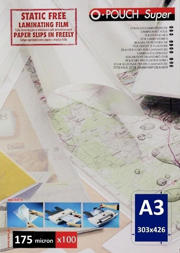 Opakowanie 100 kieszonek profesjonalnej folii do laminowania Opus O.POUCH SUPER w rozmiarze: A3 303x426 i grubości 175 mic.
