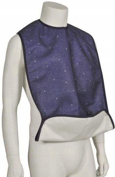 ABENA Śliniak wielorazowy 45 x 90cm niebieski. Śliniak wielorazowy ABENA przeznaczony dla dorosłych, wielokrotnego użytku. Idealny do ochrony odzieży podczas posiłków. Kołnierz regulowany jest za pomącą zatrzasków i można go dopasować do trzech rozmiarów. Śliniak posiada składaną kieszeń zbierającą mocowaną na zatrzaski, co ułatwia zatrzymanie pokarmu przed rozsypaniem czy rozlaniem. Nadaje się do prania w pralce, a specjalna struktura zapobiega kurczeniu się materiału. Właściwości śliniaka wielorazowego ABENA śliniak dla dorosłych, zmywalny - wielokrotnego użytku, możliwość prania w temperaturze do 95°C, specjalna struktura zapobiega kurczeniu się materiału podczas prania, regulowany kołnierz - dzięki zatrzaskom dopasuje się do 3 różnych rozmiarów, składana kieszeń zbierająca zapobiega rozsypaniu i rozlaniu się pokarmu, świetnie ochroni odzież podczas posiłków, szczególnie przydatny podczas opieki nad osobami niepełnosprawnymi czy leżącymi