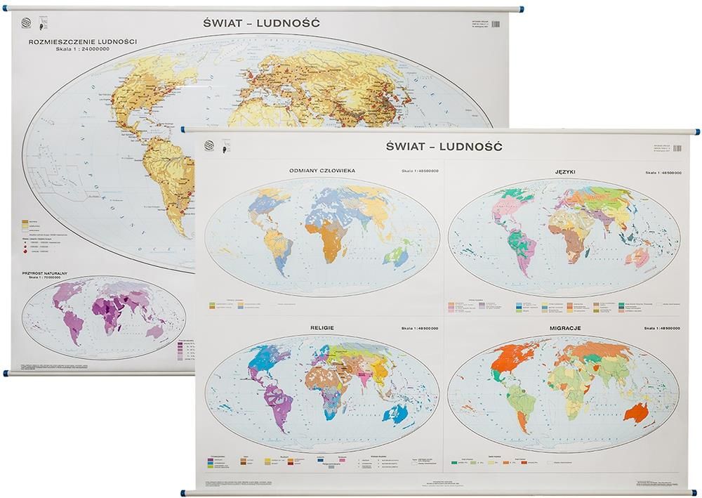 Świat - Ludność mapa ścienna 1:24 000 000 Ta dwustronna mapa idealnie sprawdzi się w szkolnej pracowni geograficznej. Pierwsza strona mapy zawiera mapki dotyczące: rozmieszczenia ludności, przyrostu naturalnego, zmian liczby ludności na świecie, gęstości zaludnienia. Rewers publikacji zawiera mapy dotyczące: odmian człowieka, języków, religii, migracji. Publikacja stanowi cenną pomoc dydaktyczną podczas realizowania treści nauczania z zakresu geografii.