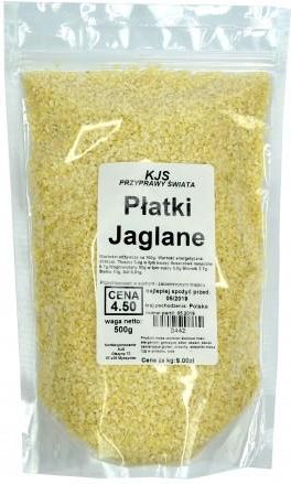 Płatki jaglane nie mają wyraźnego smaku, ale za to charakteryzują się chrupką strukturą. Stanowią źródło witamin, minerałów i prozdrowotnych właściwości. Nadają się do spożywania z mlekiem, jogurtem czy ulubionymi owocami. Zastosowanie Mogą być gotowane na wodzie, mleku czy stosowane jako dodatek do jogurtu. Sposób używania Według uznania odpowiednią ilość gotować na wolnym ogniu na wodzie lub na mleku. Można też wsypać garść jako dodatek do jogurtu. Skład: płatki jaglane Wartość energetyczna: 1482 kJ/354 kcal, Tłuszcz 3,4 g, w tym kwasy tłuszczowe nasycone 0,7 g, Węglowodany 80 g, w tym cukry 0,6 g, Białko 13 g, Sól 0,01 g. Kraj pochodzenia: Polska Masa netto: 500 g Produkt pakowany jest w opakowanie typu "doypack" ze struną, co pozwala na zachowanie długiej świeżości. To opakowanie pozwala na częste otwieranie i zamykanie. Gwarantuje trwałość i pewność co jest ważne podczas transportu. Przechowywać w suchym i ciemnym miejscu ! Produkt może zawierać śladowe ilości alergenów: gorczycę, seler, sezam, zboża zawierające gluten, orzechy, składniki mleka i jaj w proszku, soję !