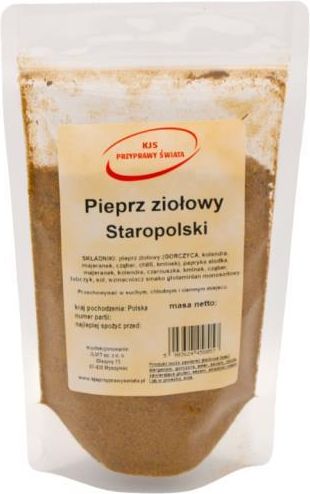 Opis produktu: Pieprz Staropolski jest mieszanką odpowiednio skomponowanych ziół i przypraw, które nie tylko nadadzą wyjątkowego smaku i aromatu naszym potrawom ale również mają działanie regulujące i przyśpieszające trawienie. Warto dodać że ziołowa szczypta smaku tego wyjątkowego pieprzu wyniesie każde danie na kulinarne szczyty. Zastosowanie -do dań z drobiu i wieprzowiny -sosów i zupy pomidorowej -ryb -masła, past warzywnych i do kanapek - do potrwa według własnego uznania Sposób używania Odpowiednią ilość przyprawy dodać się do przygotowywanej potrawy lub dodać szczyptę do mięsa i odpowiednio wymieszać. Skład: pieprz ziołowy(gorczyca, kolendra, majeranek, cząber, chilli, kminek) papryka słodka, majeranek, kolendra, czarnuszka, kminek, cząber, lubczyk, sól, wzmacniacz smaku glutaminian monosodowy. Kraj pochodzenia: Polska Masa netto: 180g Produkt pakowany jest w opakowanie typu "doypack" ze struną, co pozwala na zachowanie długiej świeżości. To opakowanie pozwala na częste otwieranie i zamykanie. Gwarantuje trwałość i pewność co jest ważne podczas transportu. Przechowywać w suchym i ciemnym miejscu ! Produkt może zawierać śladowe ilości alergenów: gorczycę, seler, sezam, zboża zawierające gluten, orzechy, składniki mleka i jaj w proszku, soję !