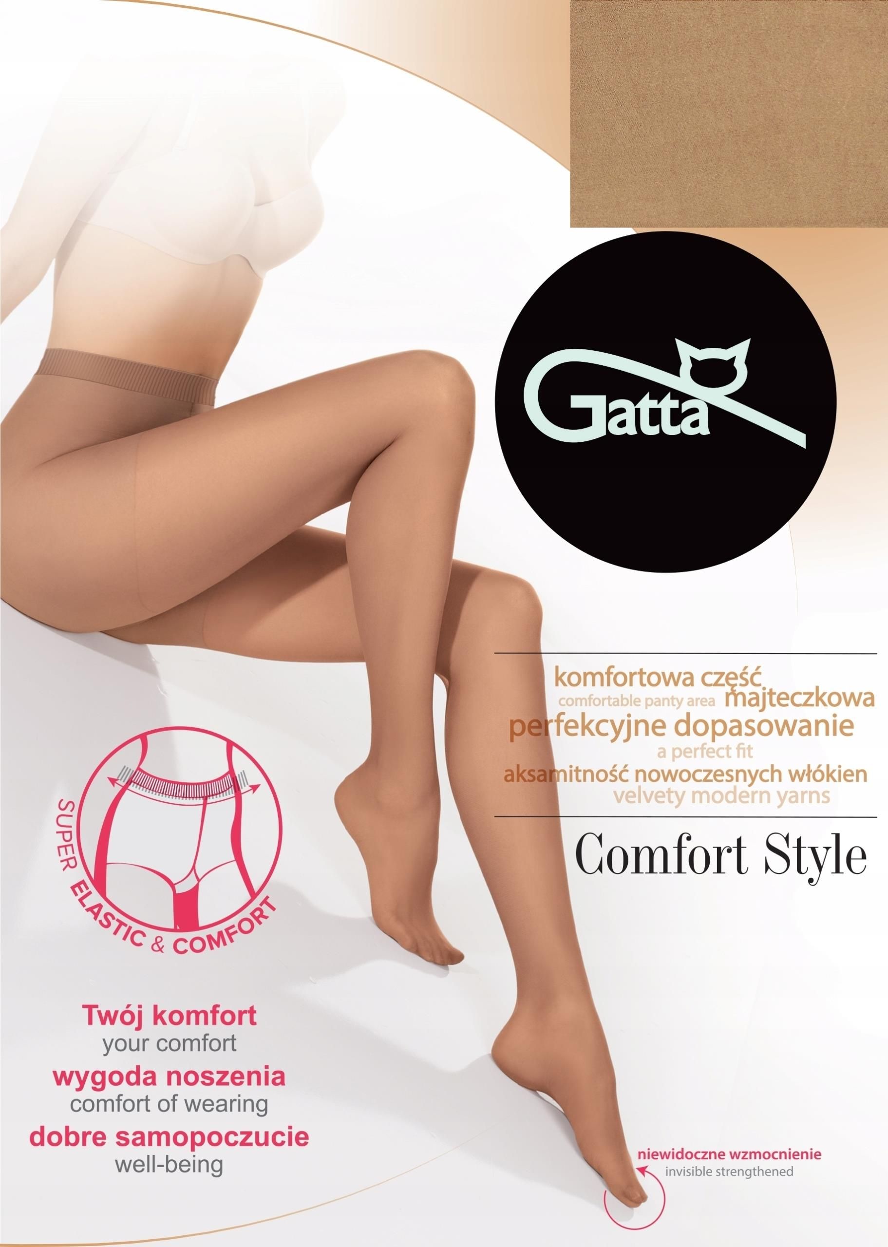 RAJSTOPY GATTA COMFORT STYLE 20 DEN 5-XL VISONE Rewolucyjne, damskie rajstopy Comfort Style to alternatywa dla wszystkich kobiet szukających idealnego modelu na wiosnę oraz wczesną jesień. Model Comfort Style od marki Gatta jest idealną alternatywą dla klasycznych cienkich rajstop. Optymalna grubość i dostępne kolory zapewnią perfekcyjne dopasowanie do bladej, jak i tej opalonej skóry. Nowoczesne rajstopy funkcyjne powstały w oparciu o technologię SATIN SHEERS by LYCRA®, która zapewnia naturalny wygląd i idealne dopasowanie. Zastosowanie techniki stopniowego ucisku, poprawia krążenie i zmniejsza opuchliznę minimalizując przy tym uczucie ociężałych nóg. Kobiecy, ponadczasowy model Comfort Style dostępny jest w grubości 20 DEN, która odpowiada na potrzeby kobiet poszukujących modeli przejściowych. Zastosowana przez markę Gatta w rajstopach Comfort Styleelastyczna i oddychająca część majteczkowa gwarantuje najwyższy poziom komfortu podczas użytkowania. Wykorzystana przy jej wykonaniu technologia, zapewniająca optymalną cyrkulację powietrza, wpływa również na utrzymanie odpowiednich warunków higieny intymnej. Podczas użytkowania daje poczucie świeżości i lekkości. Część palcowa została wzmocniona bez jej zaznaczenia, co pozwala na wykorzystanie modelu wraz z otwartymi butami, a wysoki stan wykończony płaskim szwem zapewnia dyskrecję pod każdym, nawet najściślejszym ubraniem.