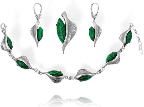 Piękny Srebrny Oksydowany Komplet z Malachitami ! Wspaniała Jakość i Atrakcyjność Wyrobu Próba 925 Waga - Bransoletka 17,3 g. Wisiorek 7,5 g. Kolczyki 7,2 g. Długość - Bransoletka 20 cm. + przedłużenie łańcuszkowe do 23 cm. Wisiorek 4,6 cm. Kolczyki 4,8 cm Szerokość - Bransoletka 1,3 cm Wisiorek 2,2 cm. Kolczyki 1,3 cm. KUPUJĄC BIŻUTERIĘ U MNIE OTRZYMUJĄ PAŃSTWO !!! ✅ Towar Zgodny z Najwyższą Sztuką Jubilerską !!! ✅ Biżuterię Przebadaną i Podbitą Przez Urząd Probierczy !!! ✅ Do Biżuterii Dołączona Jest Metka Jubilerska Potwierdzająca Próbę (nie ma na niej ceny) ✅ Zakupiona Biżuteria Wysyłana jest w Estetycznym Opakowaniu Dopasowanym do Wybranego Asortymentu ✅ Biżuterię Wysyłamy Tylko Przesyłkami Ubezpieczonymi ! Zapraszam serdecznie !!!