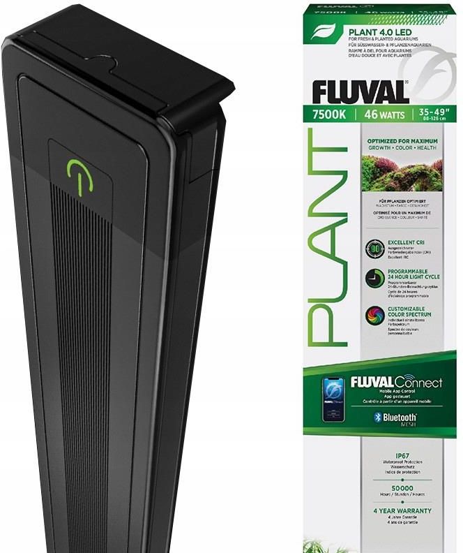 FLUVAL Oświetlenie do akwarium PLANT 4.0 LED 46W do akwarium 88,2-125,8cm Fluval Plant 4.0 LED to nowoczesna lampa akwariowa zaprojektowana specjalnie po to, by zapewnić roślinom wodnym idealne warunki do wzrostu i zdrowego rozwoju. Dzięki pełnospektralnemu światłu oraz wysokiemu współczynnikowi oddawania barw (CRI 90), Twoje akwarium zyska naturalny wygląd, a kolory ryb i roślin staną się wyjątkowo żywe i realistyczne. Konstrukcja wykonana w Niemczech gwarantuje trwałość, precyzję i najwyższą jakość. Obsługa odbywa się w pełni zdalnie za pomocą aplikacji FluvalConnect, która pozwala na pełną personalizację ustawień – od regulacji barw, przez programowanie cyklu dobowego, aż po gotowe efekty świetlne. Zawartość zestawu: Lampa LED z przewodem (2 m) Teleskopowe uchwyty montażowe Uchwyty podwyższające (riser brackets) Zasilacz Zapewnij swoim roślinom najlepsze warunki do wzrostu i wydobądź naturalne piękno swojego akwarium. Fluval Plant 4.0 LED łączy nowoczesną technologię z naturą, dając spektakularne efekty świetlne. Najważniejsze zalety Fluval Plant 4.0 LED: Światło pełnospektralne – wspiera bujny wzrost roślin, ich zdrowie i wyraziste wybarwienie. Regulowane wsporniki przesuwne – łatwy montaż na akwariach o szerokości 88–126 cm, także niestandardowych. CRI 90 – wierne odwzorowanie kolorów, naturalny wygląd roślin i ryb. Sterowanie przez aplikację FluvalConnect – prosta i intuicyjna obsługa przez smartfon. Cykl świetlny 24h – realistyczne odtworzenie naturalnego rytmu dnia i nocy (świt, południe, zachód, noc). Gotowe tryby świetlne – szybki wybór optymalnych ustawień. Wodoodporność IP67 – skuteczna ochrona przed wodą, wilgocią i pyłem. Wysokiej jakości soczewka szklana – czysta transmisja światła, bez strat i zniekształceń. Obudowa z aluminium lotniczego – efektywne chłodzenie i dłuższa żywotność diod LED. Wszechstronne możliwości montażu – teleskopowe uchwyty i uchwyty podwyższające w zestawie. Opcja zawieszenia – kompatybilna z dodatkowym zestawem montażowym (sprzedawanym osobno). Dane techniczne Rodzaj oświetlenia: LED Liczba diod LED: 252 Moc: 46 W Strumień świetlny: 3 650 lm Długość akwarium (regulacja przesuwnych wsporników): 88,2-125,8 cm Żywotność diod: 50 000 godzin Napięcie: 100-240 V / 50-60 Hz, 24 V Długość kabla zasilającego (z zasilaczem): 2,6 m Klasa ochronności obudowy lampy: IP67 Montaż: Na krawędzie szyb akwarium Ustawienie 24-godzinnego cyklu dobowego: Tak Połączenie: Bluetooth Dedykowana aplikacja Android / iOS: FluvalConnect Przeznaczenie: Akwarium słodkowodne, roślinne
