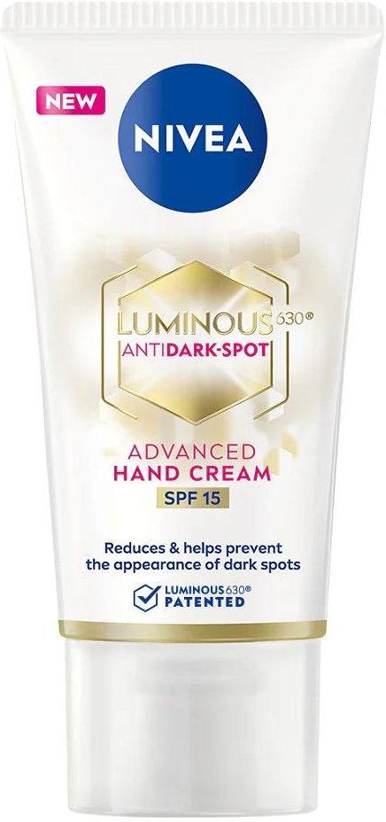 LUMINOUS630® Krem do rąk Przeciw Przebarwieniom intensywnie odżywia suchą skórę dłoni i redukuje przebarwienia. Zastosowanie: LUMINOUS630® Krem do rąk Przeciw Przebarwieniom zawiera przełomowy, wysoce skuteczny składnik LUMINOUS630®, który działa na poziomie komórkowym. Krem do rąk LUMINOUS630® już w 4 tygodnie redukuje przebarwienia i zapobiega ich ponownemu pojawianiu się. Formuła wzbogacona o Kwas Hialuronowy intensywnie odżywa suche ręce przez 24h. Filtr SPF 15 pomaga chronić skórę dłoni przed ciemnieniem i fotostarzeniem, spowodowanym promieniowaniem słonecznym. Dla wyrównanego kolorytu skóry i młodo wyglądających dłoni. Sposób użycia: Przed użyciem umyj ręce. Nakładaj delikatnie wmasowując krem w skórę dłoni. Nie pozostawia uczucia lepkości. Tolerancja dla skóry potwierdzona dermatologicznie. Produkty z linii LUMINOUS630® stosuj maksymalnie 4 razy dziennie. Unikaj bezpośredniego kontaktu z oczami. Skład: Aqua, Cetearyl Alcohol, Alcohol Denat, Butyl Methoxydibenzoylmethane, Glycerin, Cocoglycerides, C12-15 Alkyl Benzoate, Butylene Glycol Dicaprylate/Dicaprate, Bis-Ethylhexyloxyphenol Methoxyphenyl Triazine, Glyceryl Stearate, Dibutyl Adipate, Ethylhexyl Triazone, Ethylhexyl Salicylate, Butyrospermum Parkii Butter, Phenylbenzimidazole Sulfonic Acid, Diethylamino Hydroxybenzoyl Hexyl Benzoate, Stearyl Alcohol, Caprylyl Glycol, Isobutylamido Thiazolyl Resorcinol, Sodium Hyaluronate, Tapioca Starch, Xanthan Gum, Arctium Lappa Fruit Extract, Sodium Stearoyl Glutamate, Sodium Chloride, Sodium Hydroxide, Phenoxyethanol, Trisodium EDTA, Parfum. Specjalne składniki: Luminous 360, kwas hialuronowy