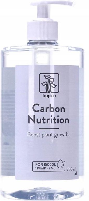 Tropica Carbon Nutrition 750 ml Nawóz weglowy dla roślin Rośliny akwariowe w trakcie wzrostu potrzebują wielu różnych pierwiastków, a te pobierane w dużych ilościach nazywane są makroelementami. Jednym z nich jest węgiel (C), który stanowi główny składnik budulcowy komórek roślinnych. W suchej masie roślin prawie połowa to właśnie węgiel – niemal tyle, ile pozostałych pierwiastków razem wziętych. Węgiel uczestniczy w przemianach energetycznych i jest niezbędny do prawidłowego przebiegu fotosyntezy. W akwariach o gęstej obsadzie roślin często pojawiają się niedobory tego pierwiastka. Doświadczeni akwaryści stosują wtedy systemy dozowania dwutlenku węgla, jednak nie każdy może sobie na to pozwolić. Alternatywą jest nawóz zawierający łatwo przyswajalne związki węgla. Jednym z takich preparatów jest Tropica Carbon Nutrition . Tropica Carbon Nutrition to wysokiej jakości nawóz węglowy, stworzony z myślą o akwarystyce roślinnej. Zawiera węgiel organiczny, który łatwo rozpuszcza się w wodzie i jest skutecznie przyswajany przez rośliny. Może pełnić rolę głównego źródła węgla w akwarium, ale równie dobrze sprawdza się jako uzupełnienie systemu CO2. Jest szczególnie polecany w akwariach o dużej ilości roślin oraz w mocno oświetlonych zbiornikach, gdzie zapotrzebowanie na makroelementy jest wysokie. Preparat wspiera intensywny wzrost roślin i poprawia ich kondycję. Dodatkowo pomaga w ograniczeniu rozwoju glonów. Przy stosowaniu zgodnym z zaleceniami producenta, jest bezpieczny zarówno dla roślin i ryb, jak i dla pożytecznych bakterii filtracyjnych. Tropica Carbon Nutrition dostępny jest w praktycznej butelce z dozownikiem. Wygodna pompka podaje 1 ml preparatu przy każdym naciśnięciu, a standardowe dawkowanie to 4 ml na 100 l wody dziennie .