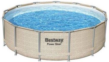 Basen PowerSteel 396 x 107 cm z daszkiem Basen na stelażu wyróżnia się wytrzymałością, wyglądem i łatwą obsługą. W letnie dni zapewni rozrywkę całej rodzinie a jego duży rozmiar umożliwi komfortowe relaks nie tylko najmłodszym. Zdejmowana osłona przeciwsłoneczna dodatkowo uprzyjemni spędzany w basenie czas.Wytrzymałe materiałyŚciany basenu Steel Pro Max zostały wykonane z materiału TritechTM. Ten trójwarstwowy, wzmocniony materiału z rdzeniem z siatki poliestrowej i dwiema warstwami PVC o dużej grubości, zapewnia wytrzymałość i trwałość oraz odporność na działanie promieni UV. Stelaż basenu wykonany z odpornego na korozję metalu, wyposażony został w system Seal & LockTM, który gwarantuje szczelne łączenie poszczególnych elementów. Sztywność stelaża dostosowana jest do rozmiarów basenu, dzięki czemu zachowuje odporność na duże obciążenia falowań wody podczas gier i zabaw.Wygląd inspirowany rattanemŚciany basenu pokryte są drukowanym wzorem przypominającym rattan, dzięki czemu basen łatwiej wpasuje się w ogrodową przestrzeń. A dodatkowych walorów estetycznych dodaje mu drukowany na dnie wzór kefelków.W zestawie pompa filtrująca, drabinka, osłona przeciwsłoneczna i dozownik chemii ChemConnectŁatwa w obsłudze pompa filtrująca pomaga zachowywać czystość wody. Komfort użytkowania podnosi drabinka ułatwiająca wchodzenie i wychodzenie z basenu. Czystość wody zapewnia dozownik chemikaliów ChemConnect. Pozwala on utrzymywać właściwą równowagę chemiczną automatycznie uwalniając potrzebne ilości chloru. Osłona przeciwsłoneczna ochroni Cię nie tylko od promieni słonecznych ale też od wiatru. Basen wyposażony w zintegrowany zawór spustowy z adapterem węża ogrodowego