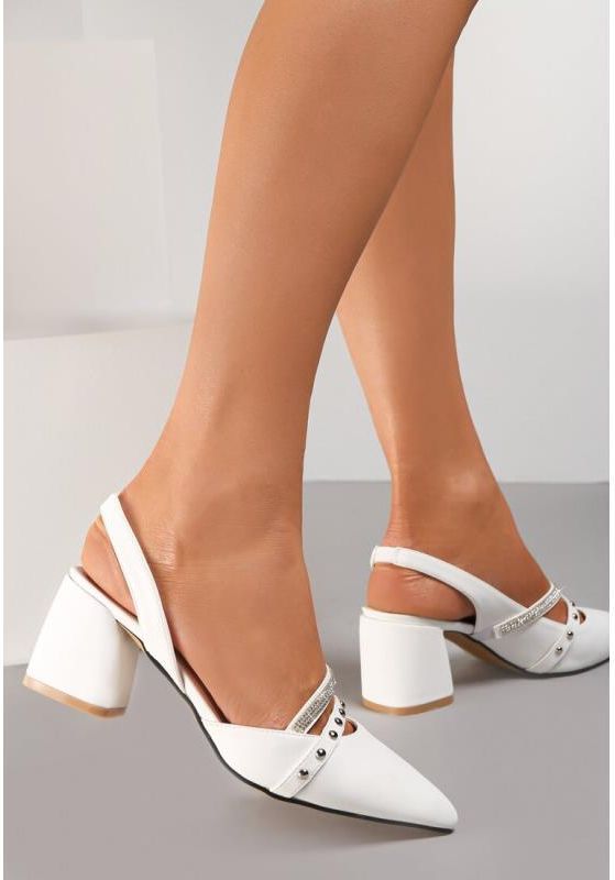 Sandały Deinare wsuwane, osadzone na niewysokim obcasie typu słupek. Ze szpiczastym noskiem zakrywającym palce. Pięta odkryta. Cholewka niska, otwarta po wewnętrznej stronie stopy. Z tyłu pasek ze sprężystą gumką. Zdobione wąskimi paskami, na które naszyto nity oraz imitację cyrkonii. Wykonane z ekoskóry. Wąskie, najlepiej leżą na smukłej stopie. Eleganckie sandały na niskim obcasie odnajdą się w garderobie każdej kobiety. Kolor: Biały Tęgość stopy: Wąski Rodzaj obcasa: Słupek Wkładka/wyściółka: Ekoskóra Materiał: Ekoskóra Nosek buta: Szpiczasty Zapięcie: Wsuwany/otwarty Sezon: Letni Wysokość obcasa: 6.5cm