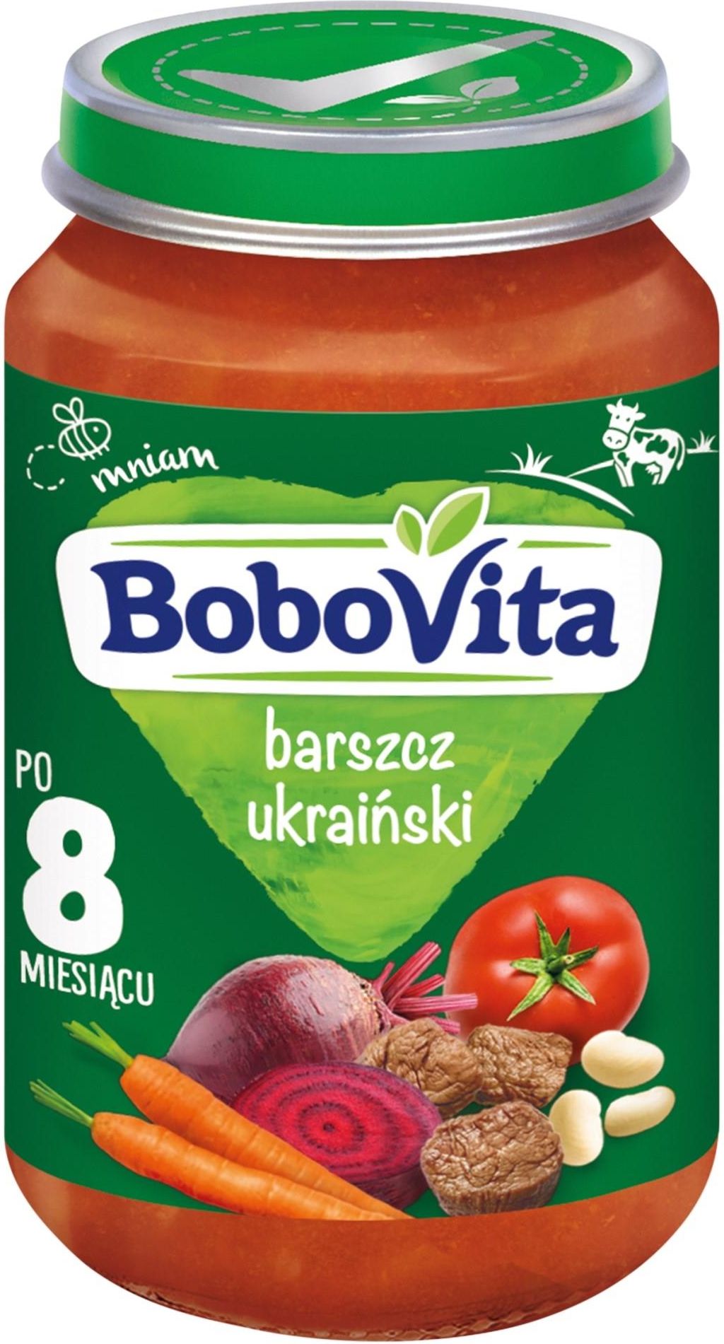 BoboVita Barszcz ukraiński 190 ml Opis produktu Produkt przeznaczony dla niemowląt po 8 miesiącu życia. Smakowity barszczyk z delikatną wołowinką i wartościowym buraczkiem w słoiczku 190 g. Ze składnikami w 100% naturalnego pochodzenia. To jakość dla Twojego Maluszka potwierdzona na 100%. Produkt utrwalony termicznie - sterylizowany. Z mięsem bez pozostałości antybiotyków. Z warzywami w 100% z kontrolowanych upraw. Prosty skład, bez zbędnych dodatków*. Pyszny zbilansowany posiłek bez dodatku soli. * Zgodnie z przepisami prawa żywność dla niemowląt i małych dzieci nie zawiera konserwantów, barwników i wzmacniaczy smaku. Przygotowanie: Odpowiednią ilość produktu przełóż do miseczki plastikową łyżeczką. Podgrzej w „kąpieli wodnej”, delikatnie wymieszaj. Sprawdź temperaturę produktu. Przestrzegaj instrukcji właściwego przygotowania. Składniki: Warzywa 51 % (buraki czerwone 14 %, odtworzony przecier pomidorowy 10,4 %, biała fasola 7,8 %, marchewka 6 %, ziemniaki, por, seler, pietruszka), woda użyta do przygotowania, mięso wołowe 8 %, skrobia kukurydziana, koper, zagęszczony sok cytrynowy, czarny pieprz.