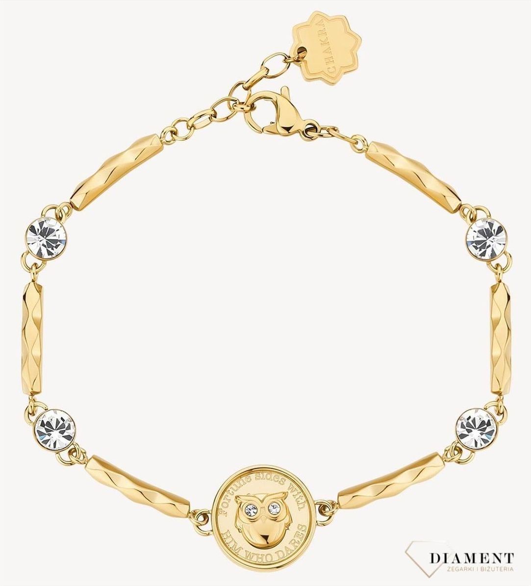 Bransoletka damska stalowa BROSWAY "Chakra Powodzenia" BHKB122 💎 INTELIGENCJA, SZCZĘŚCIE, Zuchwałość Sowa widzi w ciemności i oświetla drogę, mając zawsze oczy zwrócone na przyszłość. Intuicja, inicjatywa i inteligencja to cechy, które przekazuje każdemu, kto je posiada. Półsztywna bransoletka ze stali nierdzewnej 316L i powłoka PVD z 14-karatowego złota z sową i przezroczystymi kryształkami. Długość bransoletki 15,5 cm z możliwością przedłużenia o 2 cm Stalowa biżuteria dostępna w naszym sklepie to połączenie klasy, stylu oraz elegancji. Starannie wyselekcjonowane dodatki zachwycają wysoką jakością użytych materiałów, dbałością o każdy, nawet najmniejszy szczegół oraz niebywałą precyzją wykonania. Stworzone z myślą o każdej kobiecie, doskonale prezentują się w każdych warunkach. Zapraszamy do zapoznania się z pozostałą częścią naszej wyjątkowej kolekcji. > Kolekcja Chakra Zerknij na pozostałą ofertę! > Bransoletki damskie > Kolczyki srebrne > Pierścionki srebrne > Naszyjniki srebrne Nasz sklep internetowy z biżuterią damską Diament jest autoryzowanym dystrybutorem marki. Cała kolekcja złotej, srebrnej i stalowej biżuterii Diament zakupiona w naszym sklepie posiadają 2 letnią gwarancję i zapakowane są w oryginalne opakowanie.