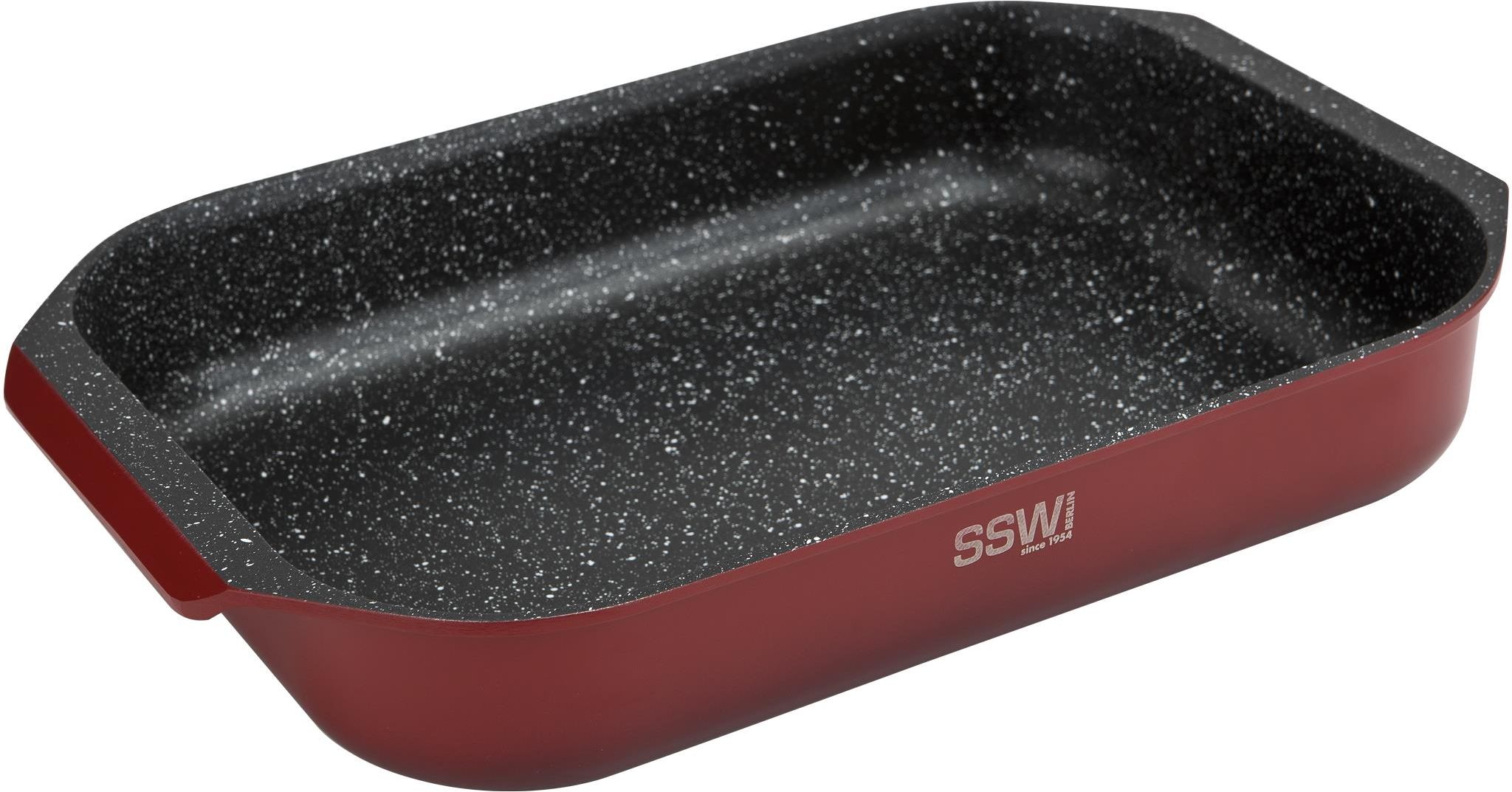 Brytfanna aluminiowa 34,5x24,5 cm BBQ CHEF czerwona Aluminiowa brytfanna BBQ CHEF, niemieckiej marki SSW. To uniwersalne naczynie w każdej kuchni. Zalety brytfanny SSW wysokiej jakości odlewane aluminium powłoka antyadhezyjna wysokiej jakości czerwony kolor nowoczesna patelnia, umożliwia zdrowe smażenie i pieczenie w małej ilości tłuszczu łatwe czyszczenie i pielęgnacja świetna do przypiekania steków, kotletów, ziemniaków itp. szybko pobiera i trzyma ciepło oszczędza energie i czas do wszystkich kuchenek, także indukcyjnych do zmywarki Brytfanna CBBQ CHEF przystosowana jest do wszystkich typów kuchenek, także indukcyjnych. Odporna do maks. temp.180°C. Nie stosować w mikrofali. Szerokość (cm): 24,5 Wysokość (cm): 6,5 Długość/głębokość (cm): 34,5 Waga (kg): 1,160 Pojemność (ml): 3900 Kolor: czerwony Można myć w zmywarce: Tak Kształt: Prostokątny Materiał wykonania: Aluminium nr katalogowy (327654) Zalety produktu piękny design znana i wiodąca niemiecka marka SSW wysoka odporność na ścieranie do wszystkich typów kuchenek pojemność producenta: 3,9 L