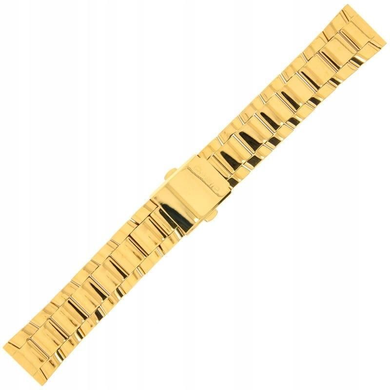 Casio Bransoleta 10185331 / 10471177 - MTP-1234G MTP-1234PG Zegarki to nie tylko narzędzia do mierzenia czasu, ale również ważny element stylizacji, który może podkreślić indywidualny charakter każdego użytkownika. W tym opisie przyjrzymy się bliżej akcesorium, które jest niezbędne dla wielu zegarków marki Casio - oryginalnej bransolecie Casio 10185331 / 10471177. Dowiesz się, jakie materiały zostały użyte do jej produkcji, jak wygląda kwestia zapięcia oraz jak bransoleta wpływa na komfort noszenia zegarka. Rodzaj akcesorium i materiał wykonania Oryginalna bransoleta Casio Bransoleta 10185331 / 10471177 - MTP-1234G MTP-1234PG to wysokiej jakości akcesorium przeznaczone do zegarków tej marki. Wykonana została z stali nierdzewnej, co gwarantuje jej trwałość i odporność na korozję. Dzięki temu materiałowi bransoleta jest nie tylko solidna, ale również elegancka, prezentując się bardzo estetycznie na nadgarstku. Kolor i wykończenie Bransoleta ma stylowy żółto złoty kolor, który doskonale komponuje się z wieloma modelami zegarków Casio. Taki kolor jest zarówno klasyczny, jak i elegancki, co sprawia, że zegarek z tą bransoletą idealnie nadaje się zarówno na oficjalne okazje, jak i na co dzień. Dodatkowo, żółto złote wykończenie podkreśla wysoki standard wykonania tego akcesorium. Zapięcie i mocowanie Bransoleta wyposażona jest w półmotylkowe zapięcie, które zapewnia pewne i bezpieczne mocowanie na nadgarstku. Materiał zapięcia to również stal nierdzewna, co dodatkowo zwiększa jego trwałość. Zapięcie półmotylkowe jest wygodne w użytkowaniu i pozwala na szybkie zakładanie oraz zdejmowanie zegarka. Wymiary bransolety Bransoleta Casio ma następujące wymiary: szerokość przy mocowaniu wynosi 20 mm, szerokość przy klamerce wynosi 18 mm, długość maksymalna wynosi 175 mm (z zaokrągleniem pomiarów ≈5mm ; +/-2mm). Dzięki tym wymiarom bransoleta jest uniwersalna i pasuje do wielu modeli zegarków Casio z serii MTP-1234G oraz MTP-1234PG. Dopasowanie do zegarka Jak wspomniano wcześniej, bransoleta Casio jest uniwersalna i pasuje do wszystkich zegarków Casio z serii MTP-1234G oraz MTP-1234PG. Oznacza to, że można ją zamontować do różnych modeli zegarków tej serii bez obaw o kompatybilność. W szczególności pasuje do modeli: MTP-1234G-7AV, MTP-1234PG-7AV. Podsumowanie Oryginalna bransoleta Casio Bransoleta 10185331 / 10471177 - MTP-1234G MTP-1234PG to doskonały wybór dla każdego posiadacza zegarka Casio z serii MTP-1234G lub MTP-1234PG. Wykonana z wysokiej jakości stali nierdzewnej, zapewnia trwałość oraz elegancki wygląd. Półmotylkowe zapięcie gwarantuje wygodę użytkowania, a uniwersalne wymiary sprawiają, że bransoleta idealnie pasuje do różnych modeli zegarków tej serii. Jeśli szukasz akcesorium, które podkreśli Twój indywidualny styl i zapewni komfort noszenia zegarka, ta bransoleta będzie idealnym wyborem.