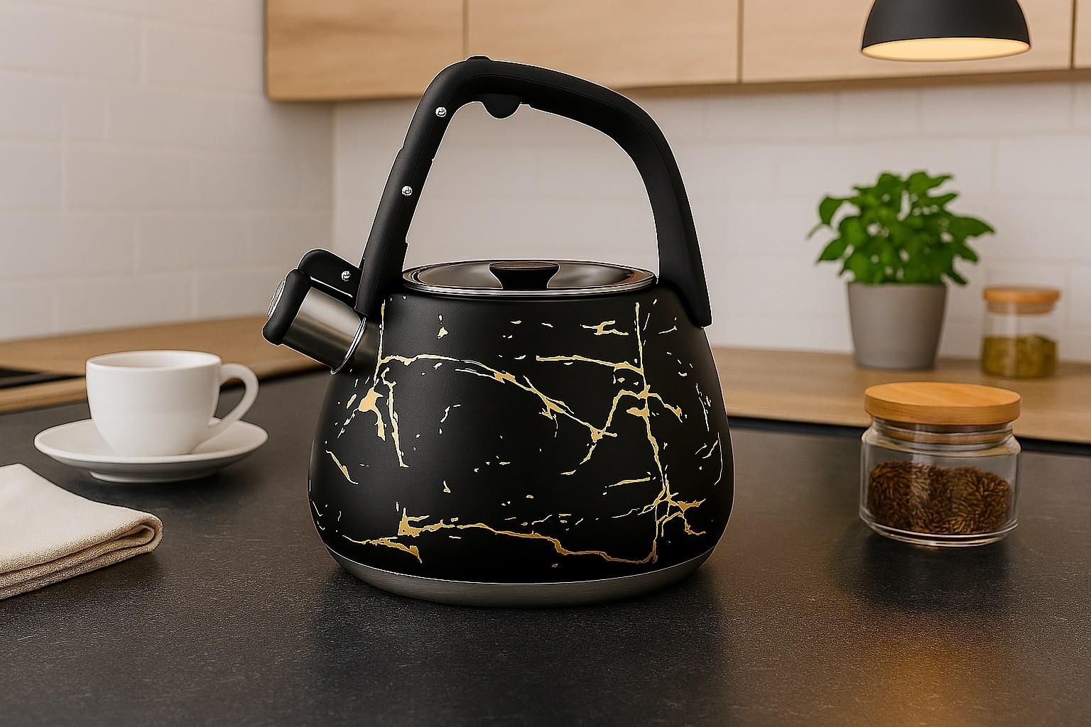 Czajnik tradycyjny Tower Marble 2,3 L – luksusowy design, funkcjonalność i uniwersalność Dodaj elegancji swojej kuchni z czajnikiem tradycyjnym Tower Marble w modnym kolorze czarny mat z marmurowym złotym wzorem. To nie tylko piękny akcent dekoracyjny, ale i praktyczne urządzenie codziennego użytku, które sprawdzi się w każdej kuchni. Dzięki dużej pojemności 2,3 litra, czajnik idealnie odpowiada na potrzeby całej rodziny oraz gości. Wykonany z wytrzymałych materiałów, wyposażony w ergonomiczną rączkę z przyciskiem do otwierania gwizdka, gwarantuje komfort oraz bezpieczne użytkowanie. Dodatkowym atutem jest uniwersalne zastosowanie na wszystkich rodzajach kuchenek – od gazowych po indukcyjne. Zalety produktu: Design premium: matowy czarny kolor z eleganckim złotym marmurowym wzorem. Ergonomiczna rączka: wygodne otwieranie gwizdka jednym przyciskiem. Duża pojemność 2,3 L: idealny dla całej rodziny i gości. Uniwersalność: kompatybilny z kuchenkami gazowymi, ceramicznymi, elektrycznymi i indukcyjnymi. Trwałość i bezpieczeństwo: solidna, stabilna konstrukcja odporna na wysoką temperaturę. Dekoracja i funkcjonalność w jednym – idealne połączenie stylu i praktyki. Pojemność całkowita: 2,8 L Pojemność użytkowa: 2,3 L Zdjęcie tytułowe ma charakter poglądowy. Prezentowana aranżacja może zawierać elementy dekoracyjne niewchodzące w skład zestawu. Szczegóły dotyczące zawartości znajdują się w opisie produktu.