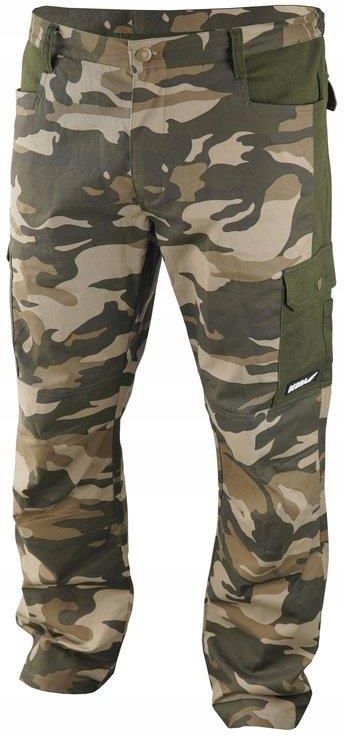 Spodnie robocze marki DEDRA. Spodnie moro w rozmiarze S. Wykonane z mieszanki bawełny i elastanu. Połączenie materiałów zapewnia dobrą cyrkulację powietrza oraz swobodę ruchów. Zastosowany elastan wpływa na wytrzymałość i zapewnia odporność na rozdarcia. Spodnie posiadają 9 funkcjonalnych kieszeni w ciemnym, zielonym kolorze, w tym dwie są zapinane na rzepy i dwie są zapinane na napy. Wszyta guma w pasie gwarantuje dobre dopasowanie i komfort podczas użytkowania.