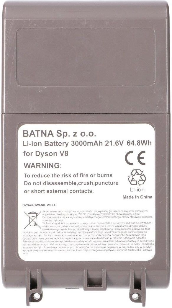 Przywróć pełną moc swojemu odkurzaczowi Dyson Bateria Dyson V8 21.6V 3000mAh to świetna opcja na przywrócenie pełnej mocy odkurzacza. Dzięki większej pojemności akumulatora, Twój odkurzacz Dyson będzie działał dłużej bez potrzeby częstego ładowania. Wymiana baterii jest szybka, łatwa i nie wymaga żadnych narzędzi, co sprawia, że jest to komfortowe rozwiązanie dla każdego użytkownika. Dłuższy czas pracy Dzięki baterii Dyson V8 21.6V 3000mAh, Twój odkurzacz będzie działał znacznie dłużej na jednym ładowaniu. Większa pojemność akumulatora zapewnia długotrwałą moc, co pozwala na wygodne sprzątanie bez potrzeby przerw na ładowanie. Jest to szczególnie przydatne w dużych domach i mieszkaniach. Kompatybilność z wieloma modelami Akumulator Dyson V8 jest kompatybilny z wieloma wersjami odkurzaczy Dyson V8, co czyni go uniwersalnym rozwiązaniem. Pasuje do takich modeli jak Dyson V8 Absolute, Dyson V8 Animal, Dyson V8 Motorhead, Dyson V8 Fluffy. Dzięki temu nie musisz martwić się o dopasowanie baterii do swojego odkurzacza. Kilka powodów, dla których warto wymienić baterię Większy czas pracy – nowa bateria Dyson V8 zapewnia dłuższy czas pracy na jednym ładowaniu dzięki pojemności 3000mAh. Dzięki temu możesz sprzątać bez przerw. Lepsza moc i wydajność – akumulator przywraca pełną moc odkurzacza, co poprawia jakość czyszczenia na dużych powierzchniach. Bezpieczniejsze użytkowanie – bateria posiada systemy ochrony przed przegrzaniem i zwarciem, co zwiększa bezpieczeństwo urządzenia. Łatwa instalacja i oszczędność – wymiana baterii jest szybka i nie wymaga narzędzi, a nowa bateria to tańsza opcja niż zakup nowego odkurzacza. Specyfikacja Pojemność: 3000mAh Napięcie: 21.6V Typ akumulatora: Li-ion Kompatybilność: Dyson V8 Absolute, Dyson V8 Animal, Dyson V8 Motorhead, Dyson V8 Fluffy, Dyson V8 Total Clean