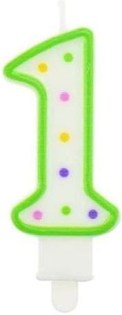 Świeczka urodzinowa w kolorowe kropeczki - cyfra 1. - Niezbędny element imprezy urodzinowej oraz jubileuszowej. - Stanowi doskonały pomysł na dekoracje tortów! - Długość: 7,5 cm - Długość całkowita: 9 cm - Kolor: ZIELONY