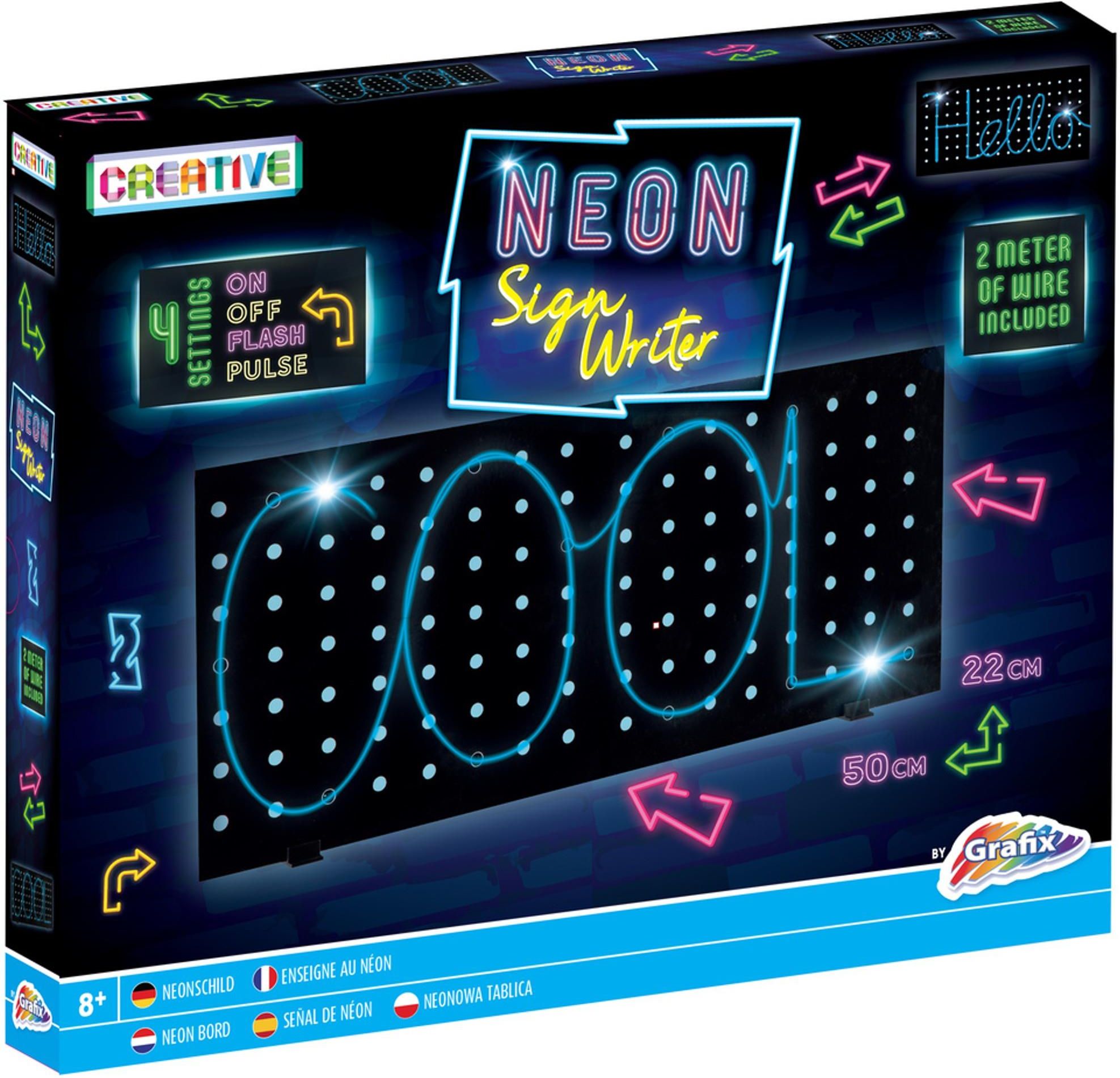 Grafix Neon Sign Writer Neonowa Tablica Produkt przygotowany został przez markę Grafix. Zabawka pozwala za pomocą 2-metrowego kabla stworzyć dowolny świecący napis na tablicy o wymiarach 50 x 22 cm. Przewód neonowy mocuje się za pomocą dołączonych do zestawu kołków. Możliwe są 4 tryby - włączony, wyłączony, błysk i puls. Zestaw zawiera: tablicę, 25 kołków, 2 plastikowe podpórki, akumulator zasilany bateriami, niebieski przewód neonowy - 2 m, instrukcję obsługi. Ta kreatywna zabawka z pewnością szybko się nie znudzi i może stanowić ciekawy element wystroju pokoju! Zabawka przeznaczona dla dzieci od 8 roku życia Wymiary tablicy: 50 x 22 cm Wymaga użycia baterii: 3 x AA (brak w zestawie) Wymiary opakowania: 30 x 25 x 4 cm Kod producenta: 200025, 201849