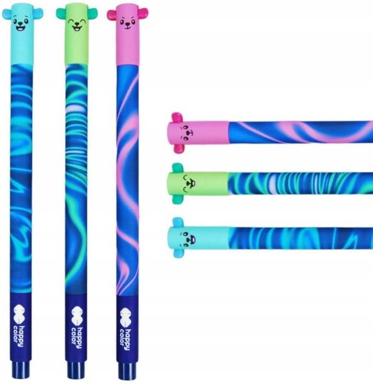 Happy Color 3 sztuki WYMAZYWALNYCH DŁUGOPISÓW MAGIC SKY Wymazywalne długopisy żelowe w kolorowej obudowie Dzięki unikalnej formule tuszu napisany tekst można łatwo wymazać i poprawić Gumka do wycierania znajduje się na skuwce Miękka obudowa typu soft Wymienne wkłady Grubość linii pisania 0,5 mm …