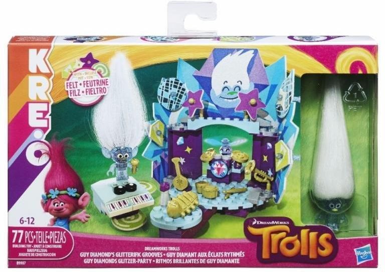 Hasbro Kre-O Trolle - Zestaw Troll Guy Diamond B9987 KRE-O to nie tylko klocki! Te kreatywne zestawy zawierają elementy z miękkich materiałów, co w połączeniu z pięknymi kolorami, pobudzi wyobraźnie każdego! Guy Diamond to niezwykle muzyczny Troll, który gotowy jest zagrać iście diamentowy koncert! Popatrz, jak szaleje na owadowym pianinie, odgrywając największe przeboje! To jednak nie wszystko! Zestaw instrumentów pozwoli mu przejąć niejedną imprezę. A czy ty dasz się ponieść twórczości Trolla?   Zawartość zestawu: figurka Guya Diamonda klocki do budowy sceny instrumenty muzyczne miękkie elementy do ozdoby uzupełniające akcesoria tematyczne, wzbogacające zabawę "Trolle" to niesamowita opowieść twórców "Shreka". Przepełnione radością życia, rozśpiewane stworki, obdarzono bajecznie kolorowymi włosami, układającymi się w najniezwyklejsze fryzury. Życie trolli i ich magiczna kraina zmieni się na zawsze, gdy jedna z jej mieszkanek, Poppy, wyruszy z misją ratunkową, która zaprowadzi ją w szeroki, nieznany dotąd świat…