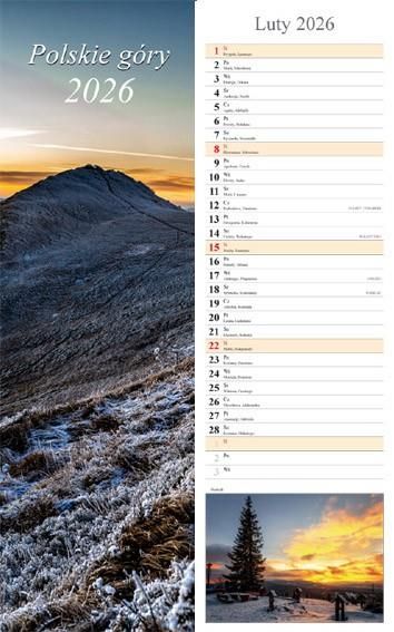 Kalendarz 2026 ścienny, pasek, 13 plansz, Polskie góry Kalendarz wieloplanszowy ma szeroki pasek. 12 kart i okładkę pokrytą lakierem UV. Miesiąc na stronie, spięty spiralą wraz z drucianą zawieszką. Kalendarium jest przejrzyste, zaznaczone święta i niedziele handlowe. Kalendarz charakteryzuje się umiejętnym połączeniem estetyki kalendarium wraz z jego funkcjonalnością.Wymiary: 15.0 x 48.0 cm