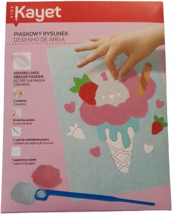 Kayet piaskowy rysunek 8 kolorów 2 szblony pobudza artystyczną wyobraźnię pozwala na stworzenie własnego dzieła w zestawie: 2 szblony, 8 kolorów piasku, 1 rysik do nakładania piasku, 1 papierowy stand