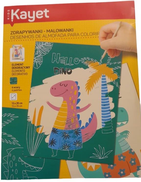 Kayet Zdrapywanki malowanki 15x20cm 4 wzory DINOZAURY Zabawa polega na zdrapywaniu górnej warstwy farby specjalnym rysikiem, w zaznaczonych miejscach na arkuszach - co pozwala na stopniowe odsłanianie pięknego, ukrytego rysunku. Jest to wspaniała zabawa dla każdego. Obrazy zdrapki to nie tylko zabawa, ale także ćwiczenie sprawności manualnej oraz wyobraźni przestrzennej u najmłodszych, ale i też tych starszych. Zestaw zawiera 4 arkusze do zdrapywania o wymiarach 15x 20 cm 1 patyczek do zdrapywania tekturowy stojak do oparcia obrazka dla dzieci powyżej 3 roku życia